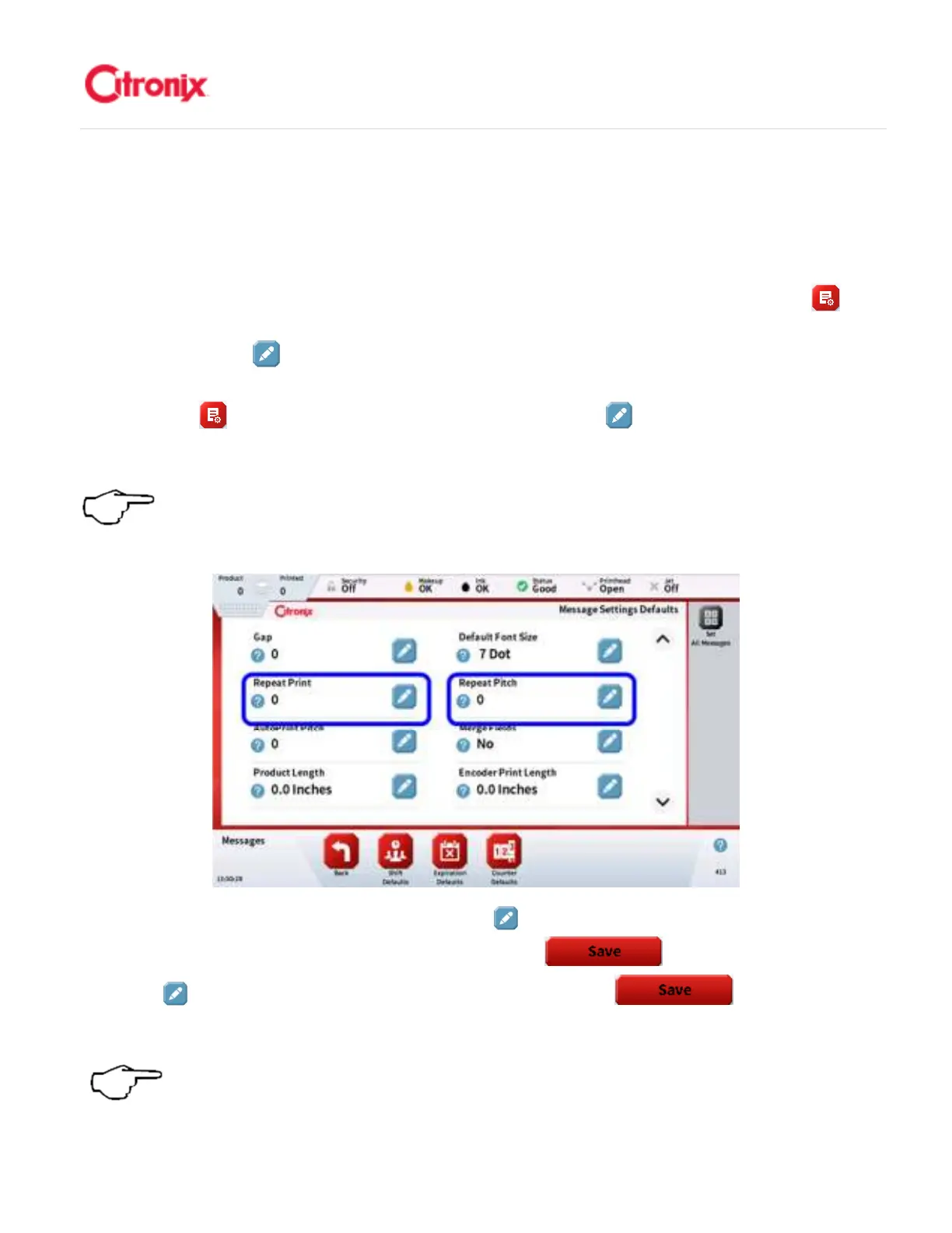 Once the number of repeat print is set, press the [Edit] Button to set the Repeat Pitch using the