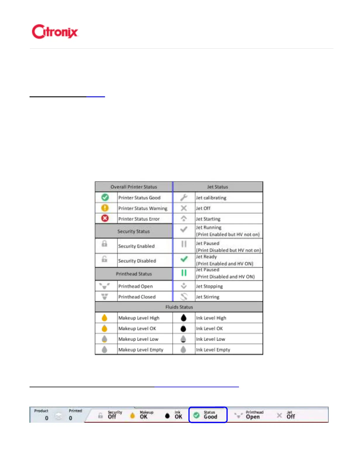 Citronix printers display the most frequently used and important information on the Status Bar shown