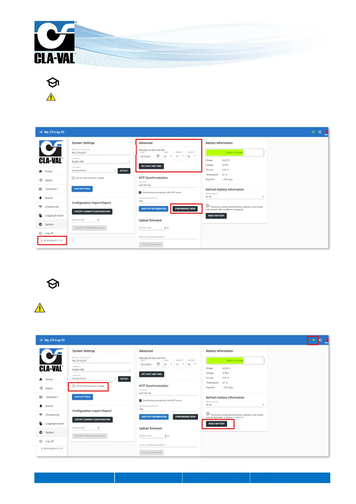 8. Check that the time displayed on the clock below the navigation menu is correct. If not, you can set the time manually in
