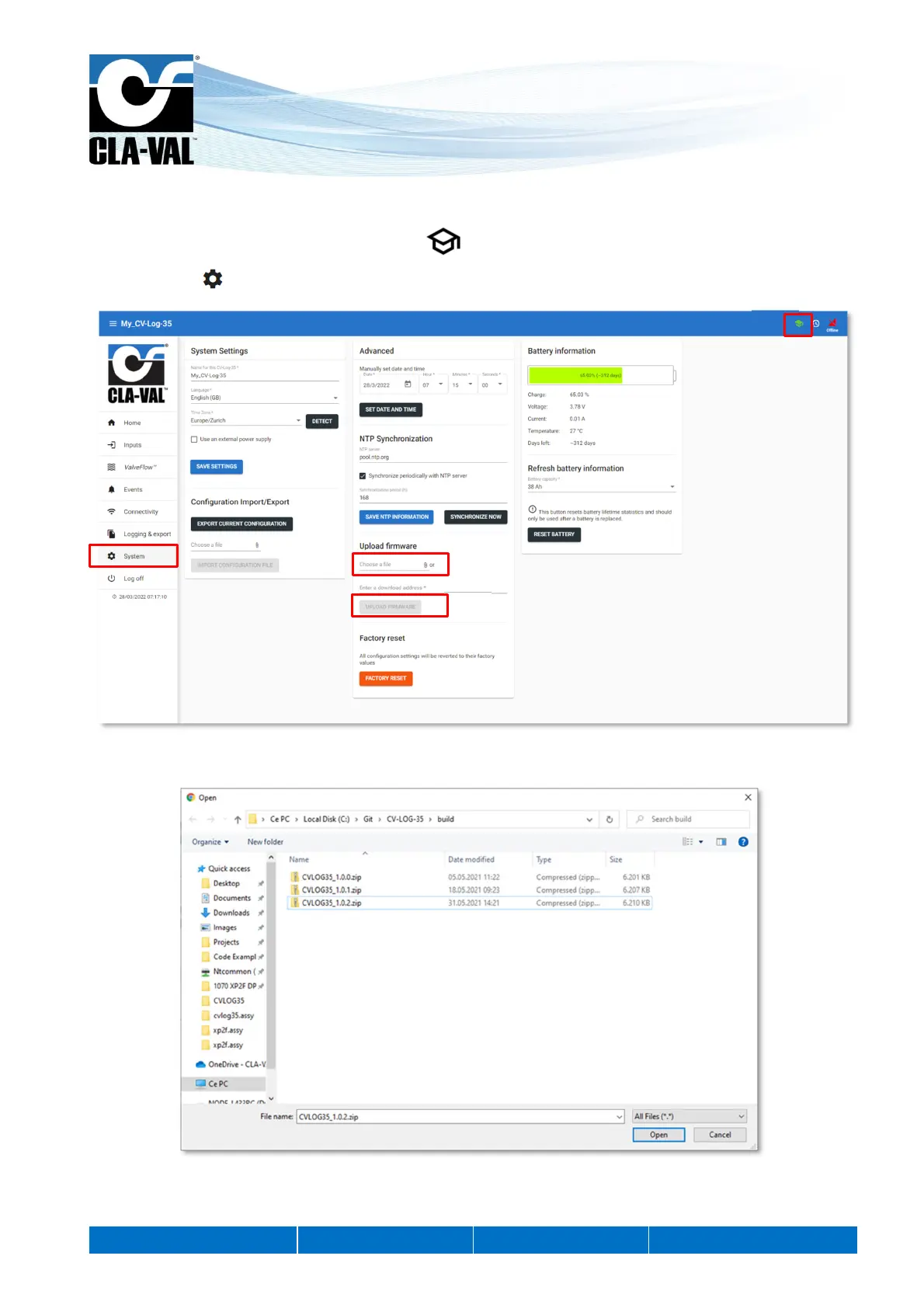 3. In the «Upload firmware» submenu, locate and select the distribution ZIP file for example "CVLOG35_1.0.2.zip".