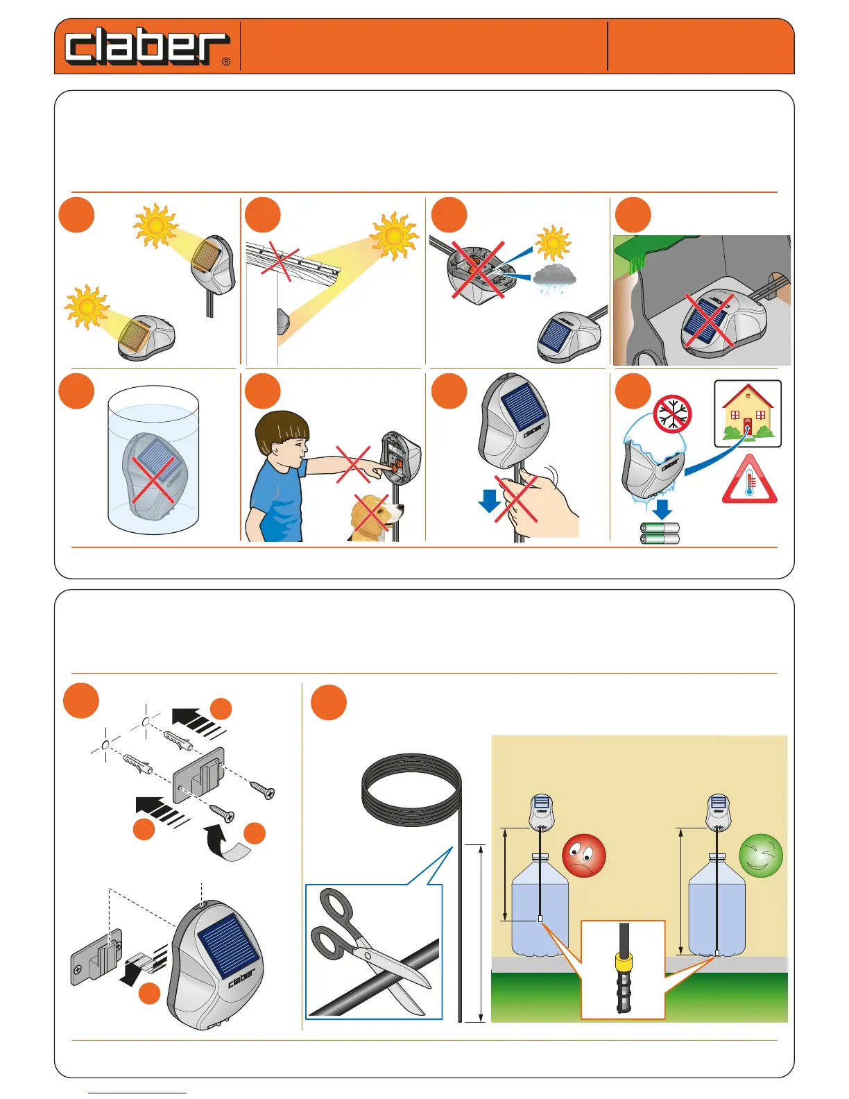 the sunlight can reach it (2). It must be positioned with the photovoltaic panel facing upwards (3). It should not be