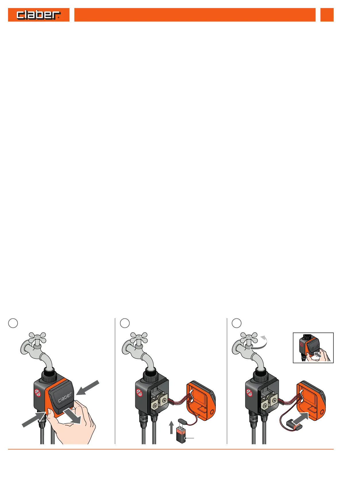 EINLEGEN DIE BATTERIE. Betätigen Sie die beiden seitlichen Tasten, um den Bewässerungscomputer zu önen und setzen Sie ein neue Alkaline 9 V