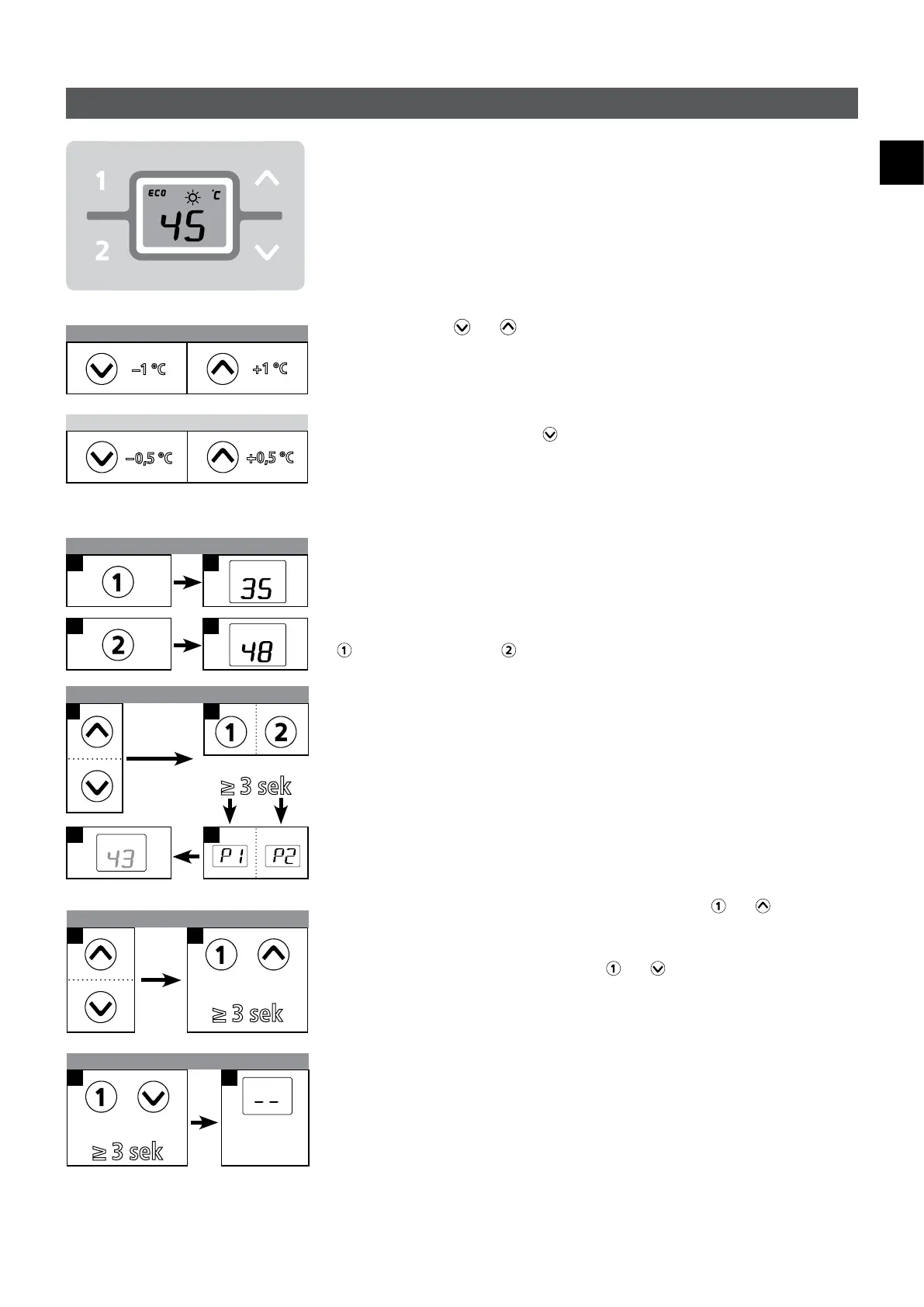 Komfort bereich zwischen 35,0 und 42,0 °C nur um 0,5 °C. Wenn Sie eine Taste länger