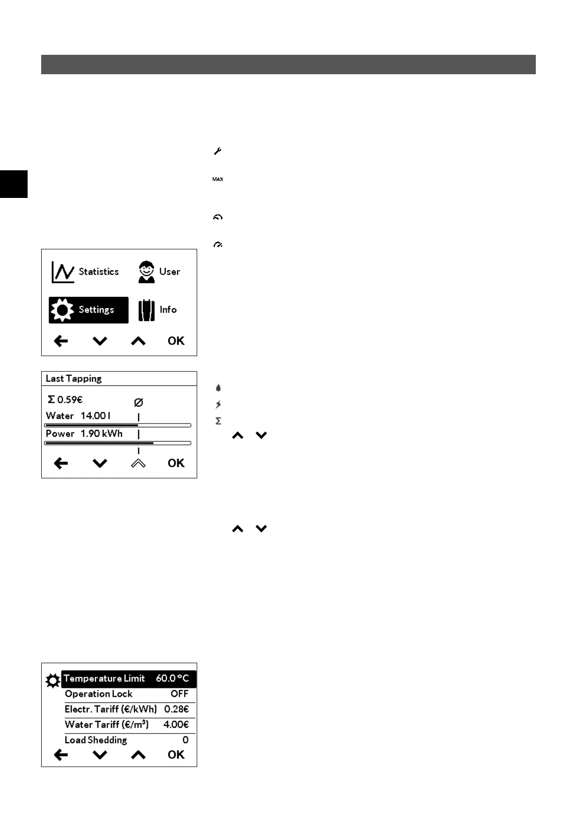 menu worden geactiveerd / gedeactiveerd en de maximale warmwatertemperatuur