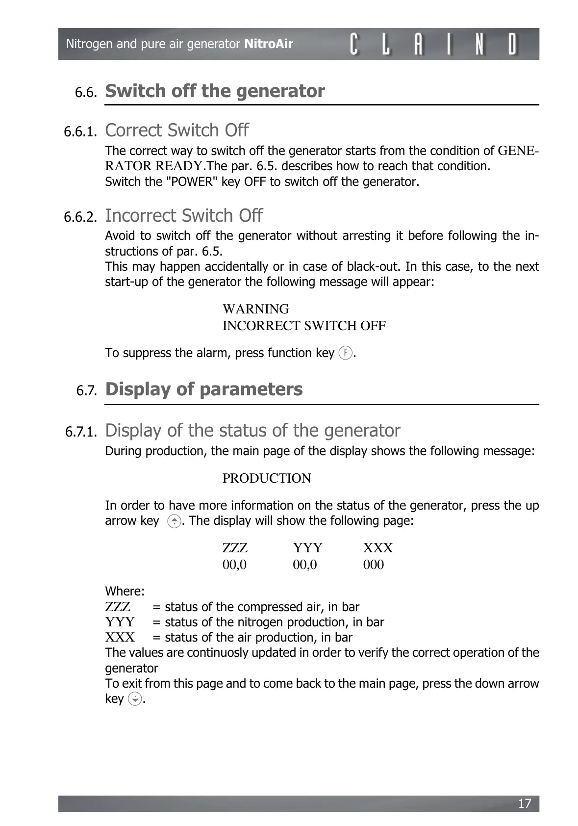 Avoid to switch off the generator without arresting it before following the in-