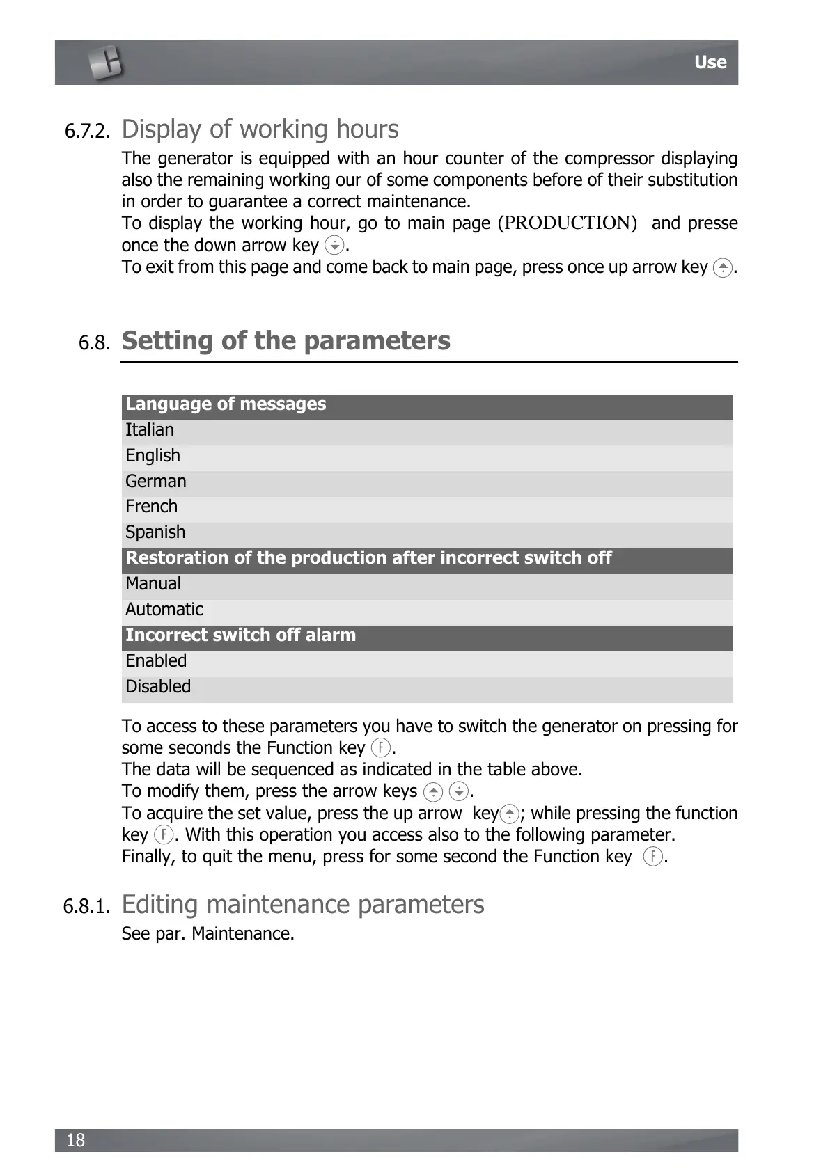To access to these parameters you have to switch the generator on pressing for