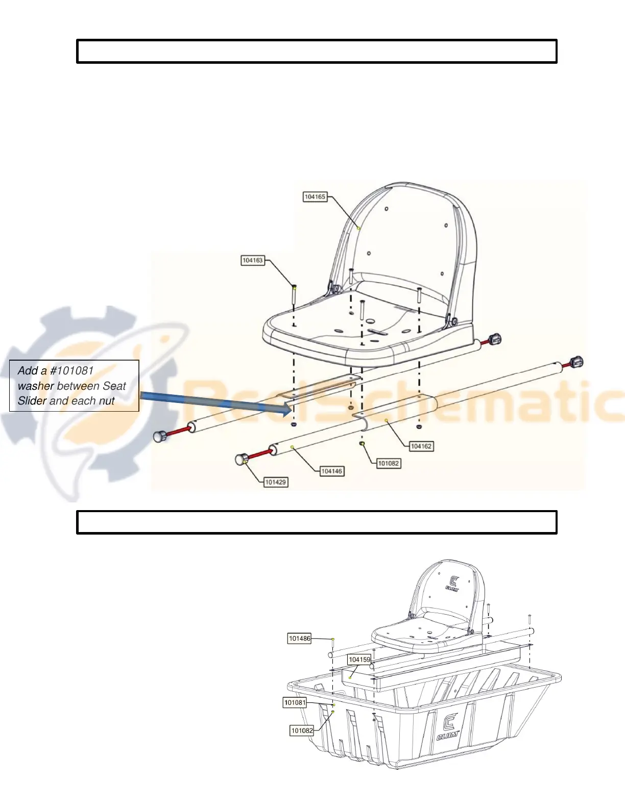 C. Install the Deluxe Seat #104165 onto sliders using the OUTER holes on seat with the hardware shown.