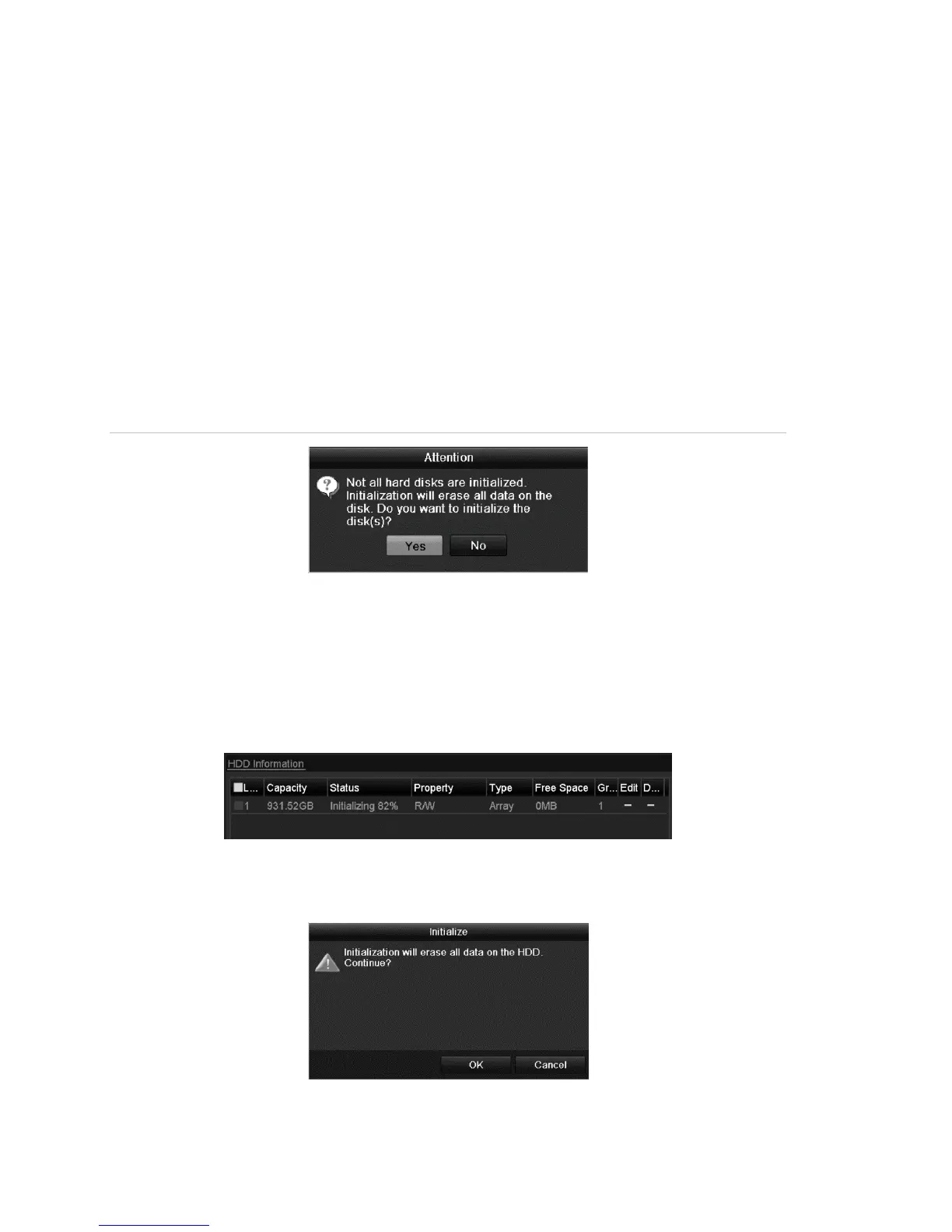 • When the NVR starts, a dialog displays if any uninitialized HDD exists.