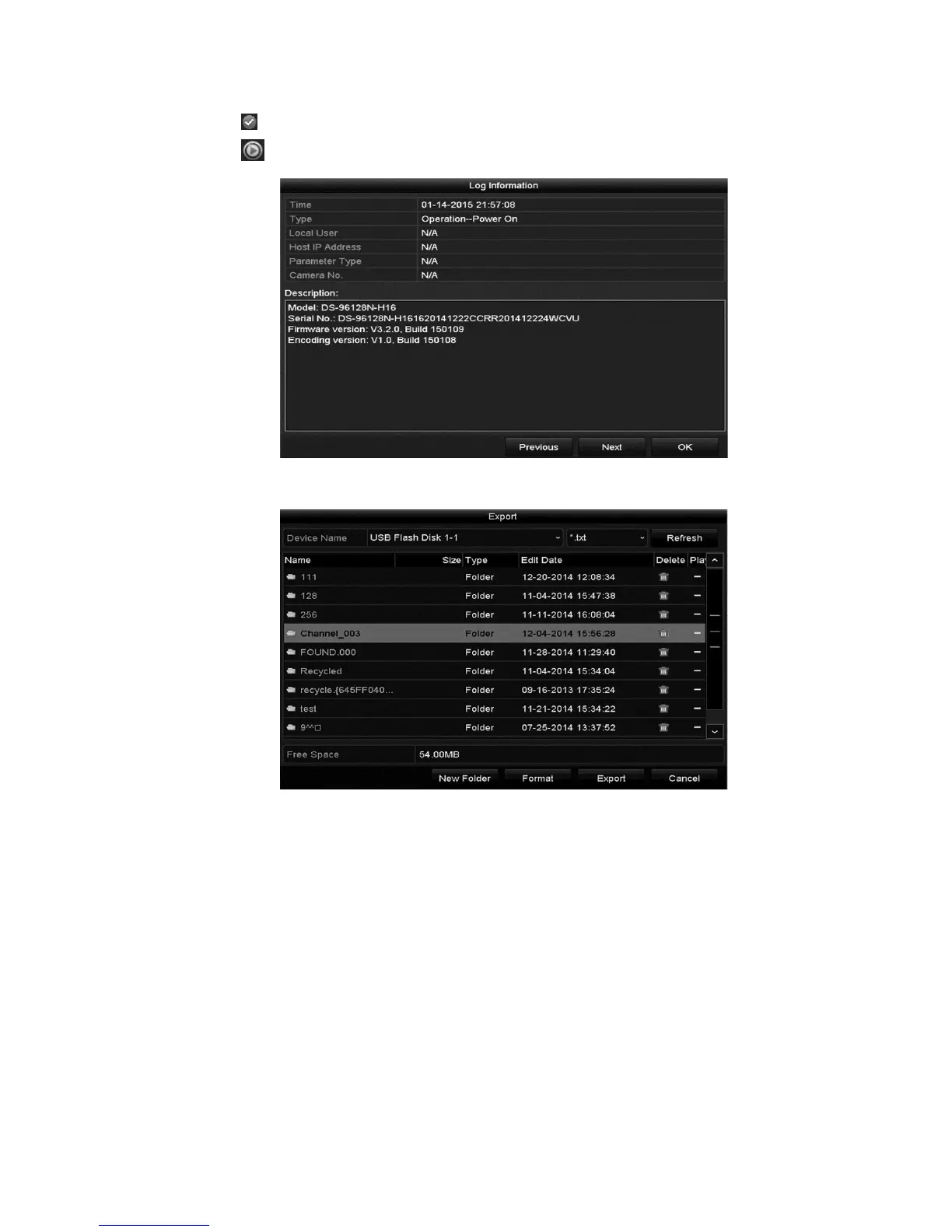 Note: Connect the backup device to the NVR before exporting the log files.