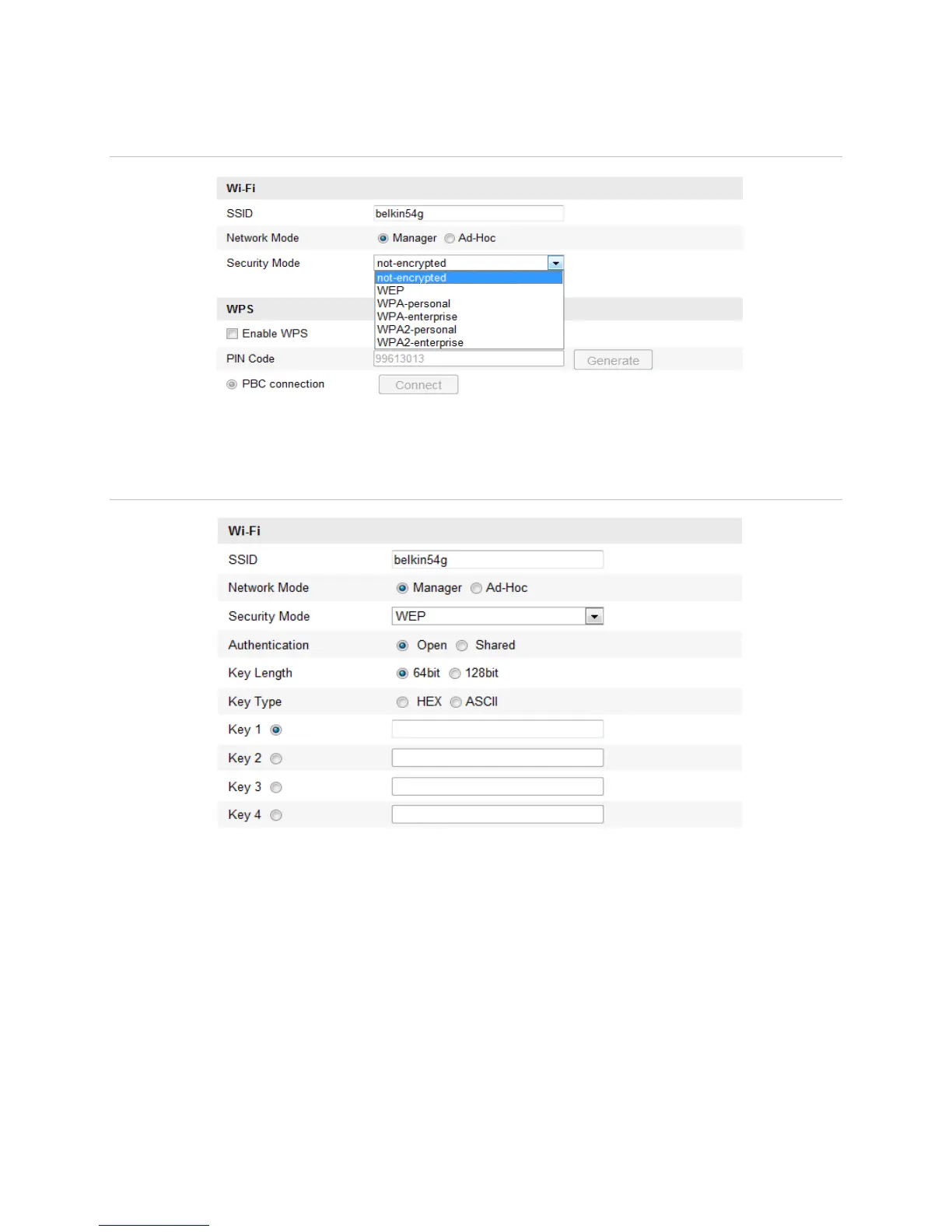 You select the Security Mode; not-encrypted, WEP, WPA-personal, WPA-enterprise,