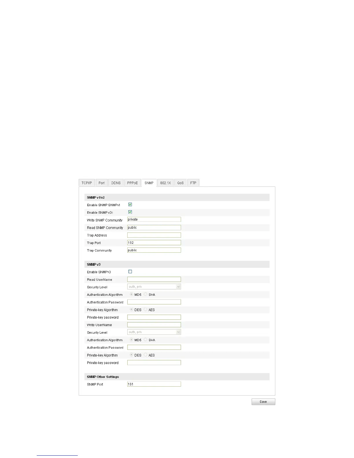 You can set the SNMP function to get the camera status, parameters, alarm-related