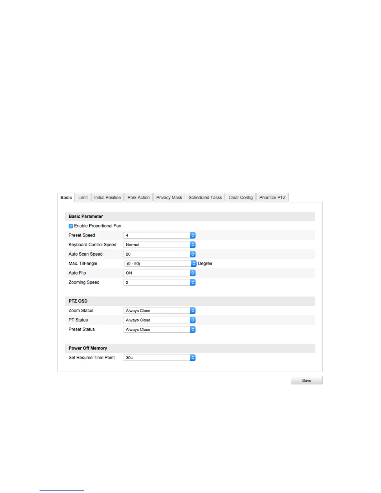 Configuration > Camera Configuration > PTZ > Basic