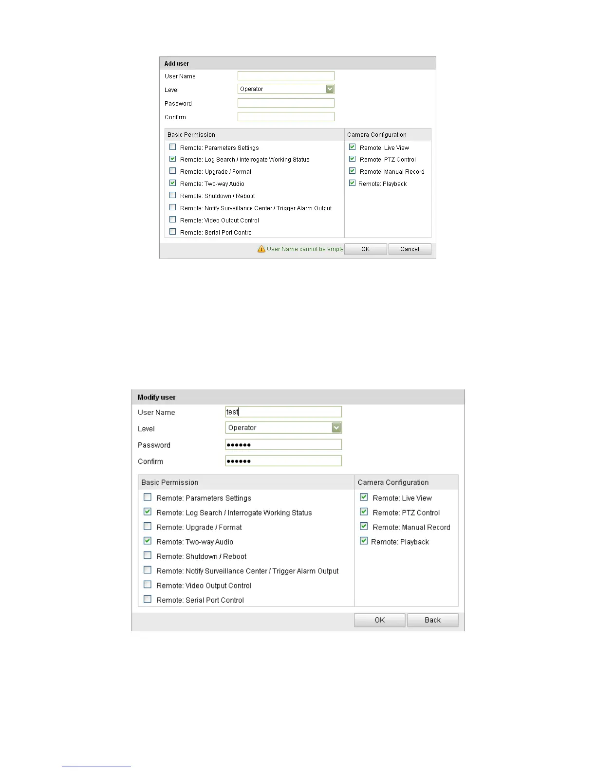 3. In the Basic Permission field and Camera Configuration field, you can select or