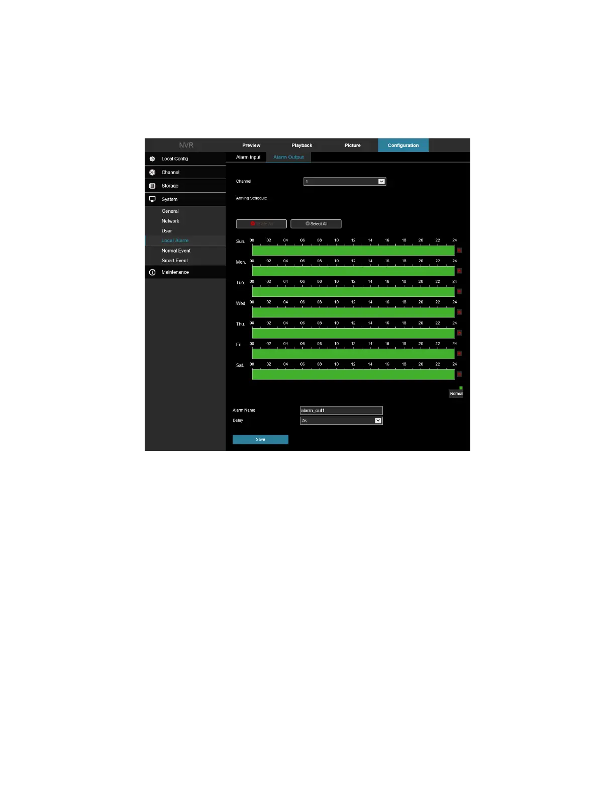 In the main interface, click Configuration → System → Local Alarm → Alarm Output to enter the Alarm Output