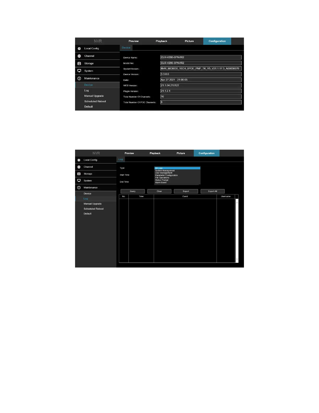 • Export: Export the searched log information and store it on the U disk of the connected device.
