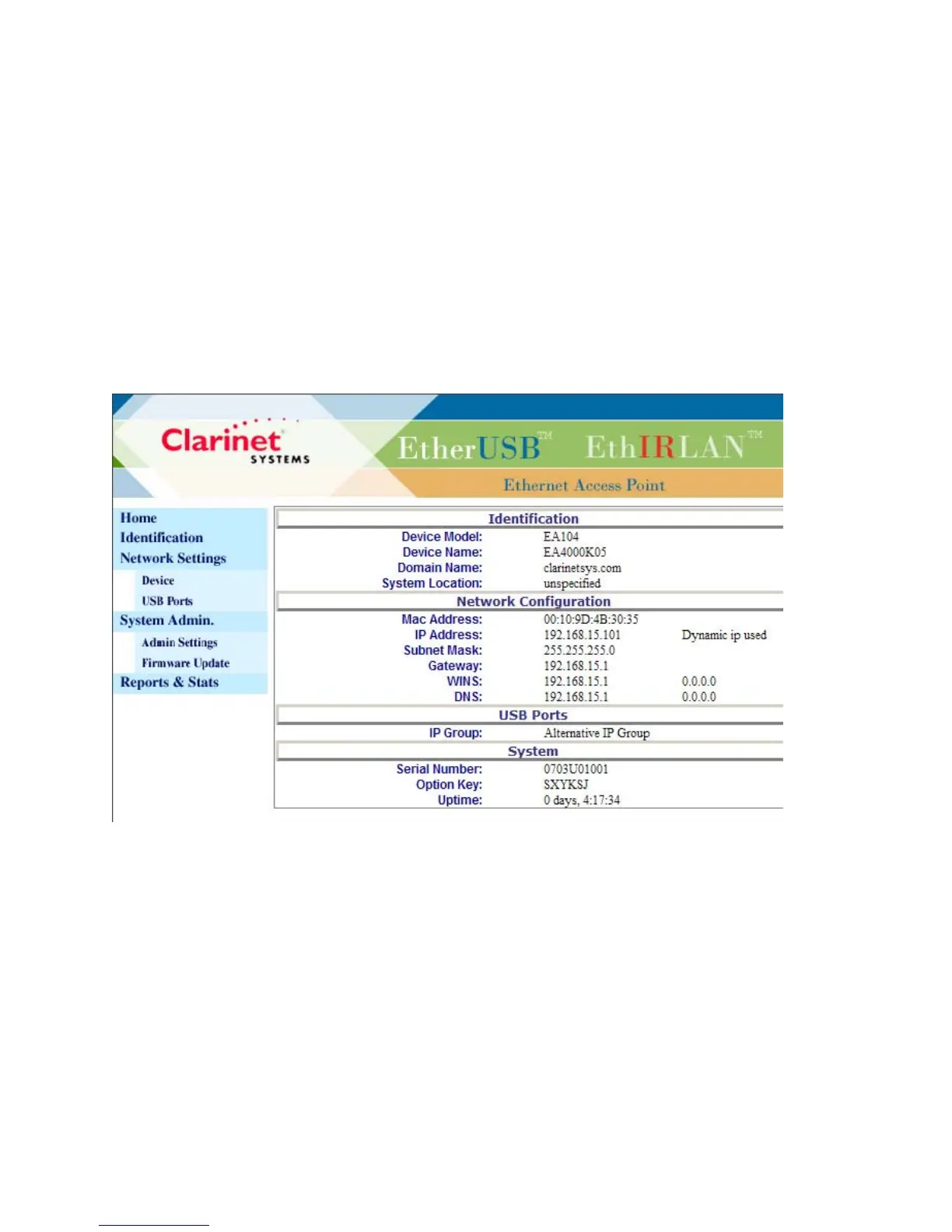 system. For example, if the EA104 device is set for DHCP, the IP Address area will