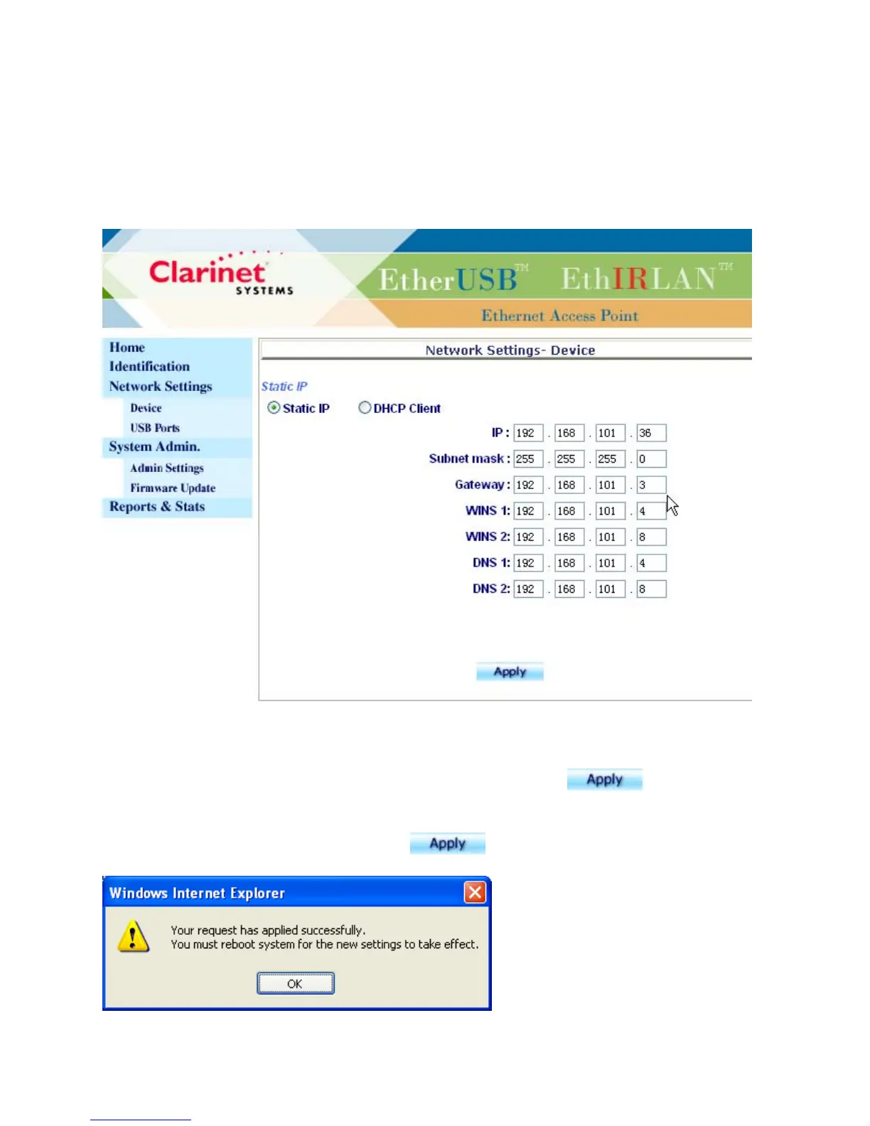 the device. The user can modify the fields and click on Apply to have the new settings