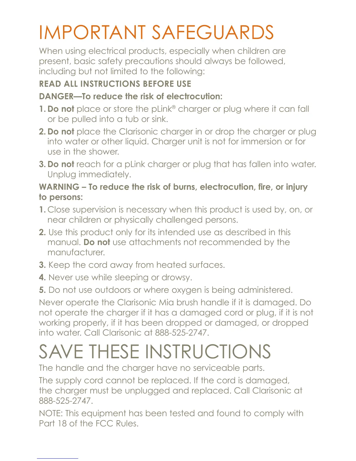 2. Do not place the Clarisonic charger in or drop the charger or plug