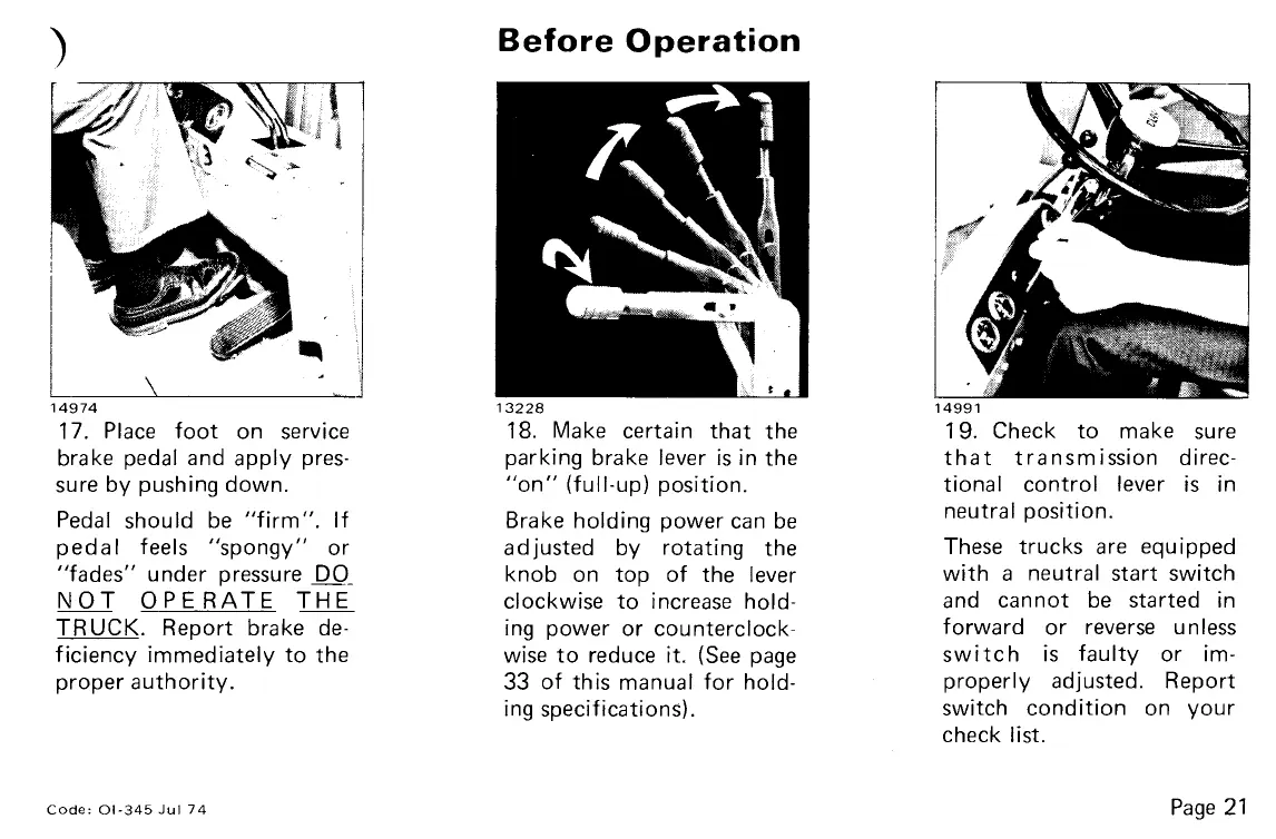 Clark C300 40 - Before Operation Checks (Brake and Drive System); Service Brake Pedal Application; Parking Brake Release Procedure; Transmission Directional Selection