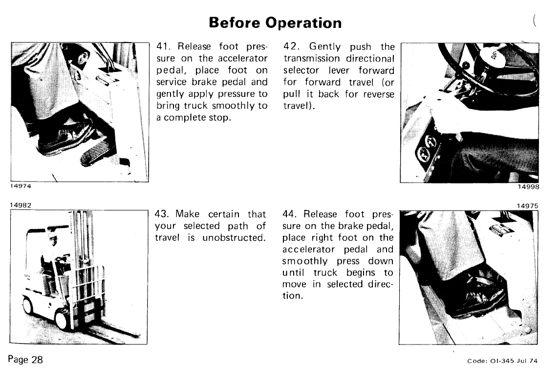 Clark C300 40 - Parking Procedures; Designated Parking Areas and Obstruction Avoidance; Neutral Transmission and Parking Brake Application; Fork and Upright Positioning