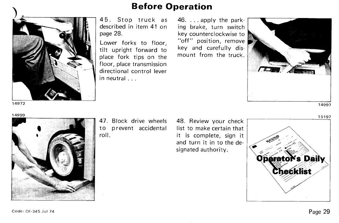 Clark C300 40 - Parking Procedures (Final Steps); Ignition Off and Key Removal (Gas); Fuel Supply Shut-Off and Dismounting (LP Gas); Drive Wheel Blocking and Key Submission