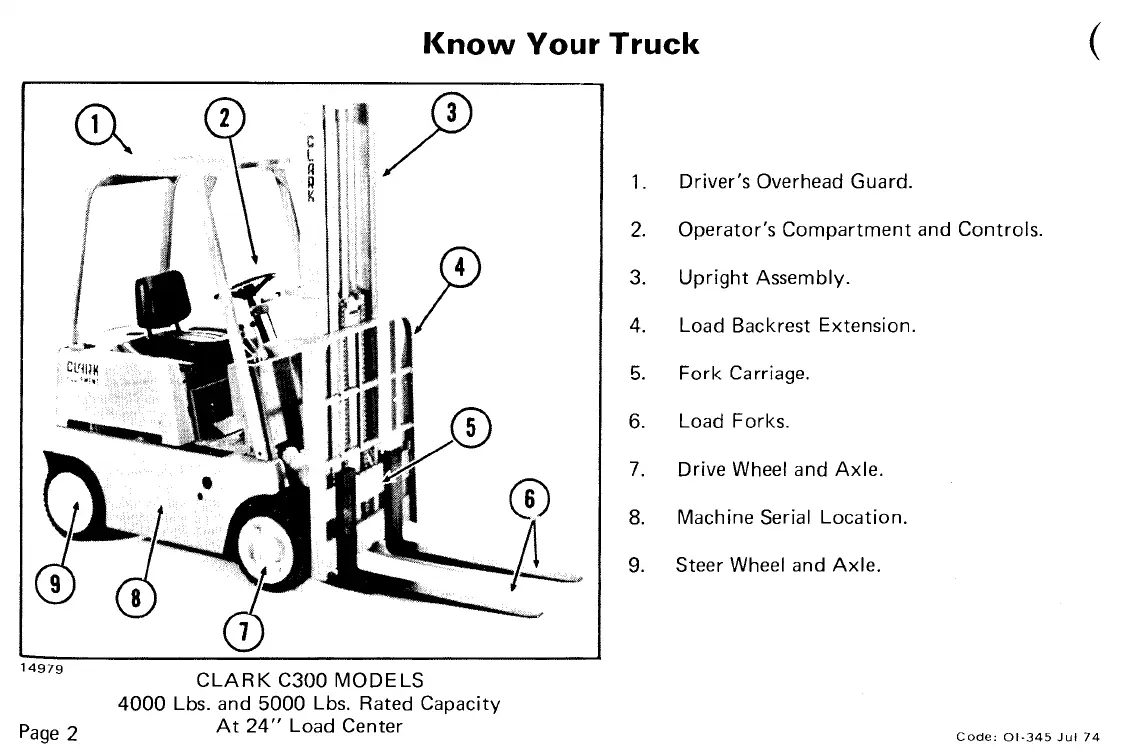 Clark C300 40 - Know Your Truck; Drivers Overhead Guard and Operator Compartment; Mast, Fork Carriage, and Load Forks; Wheel and Axle Assemblies