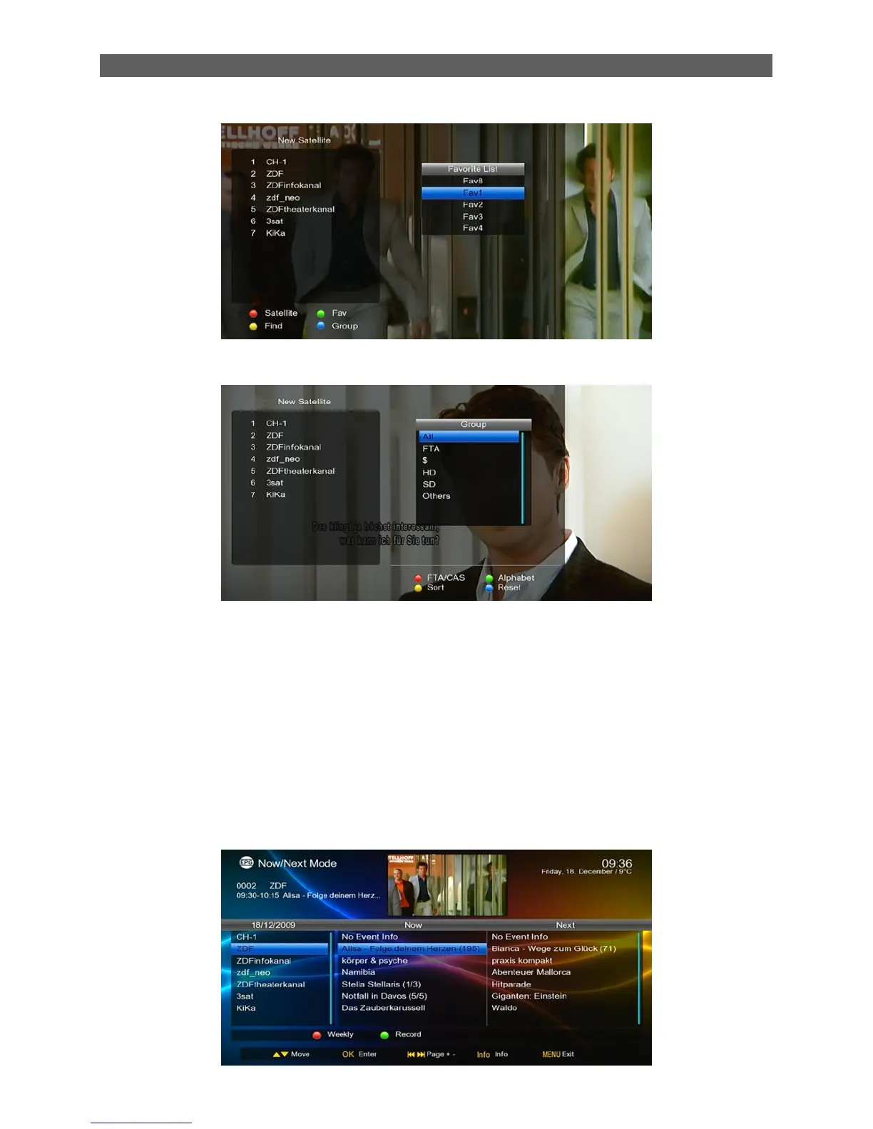 EPG info has three modes: Now/Next Mode, Daily Mode and Weekly Mode. The system will
