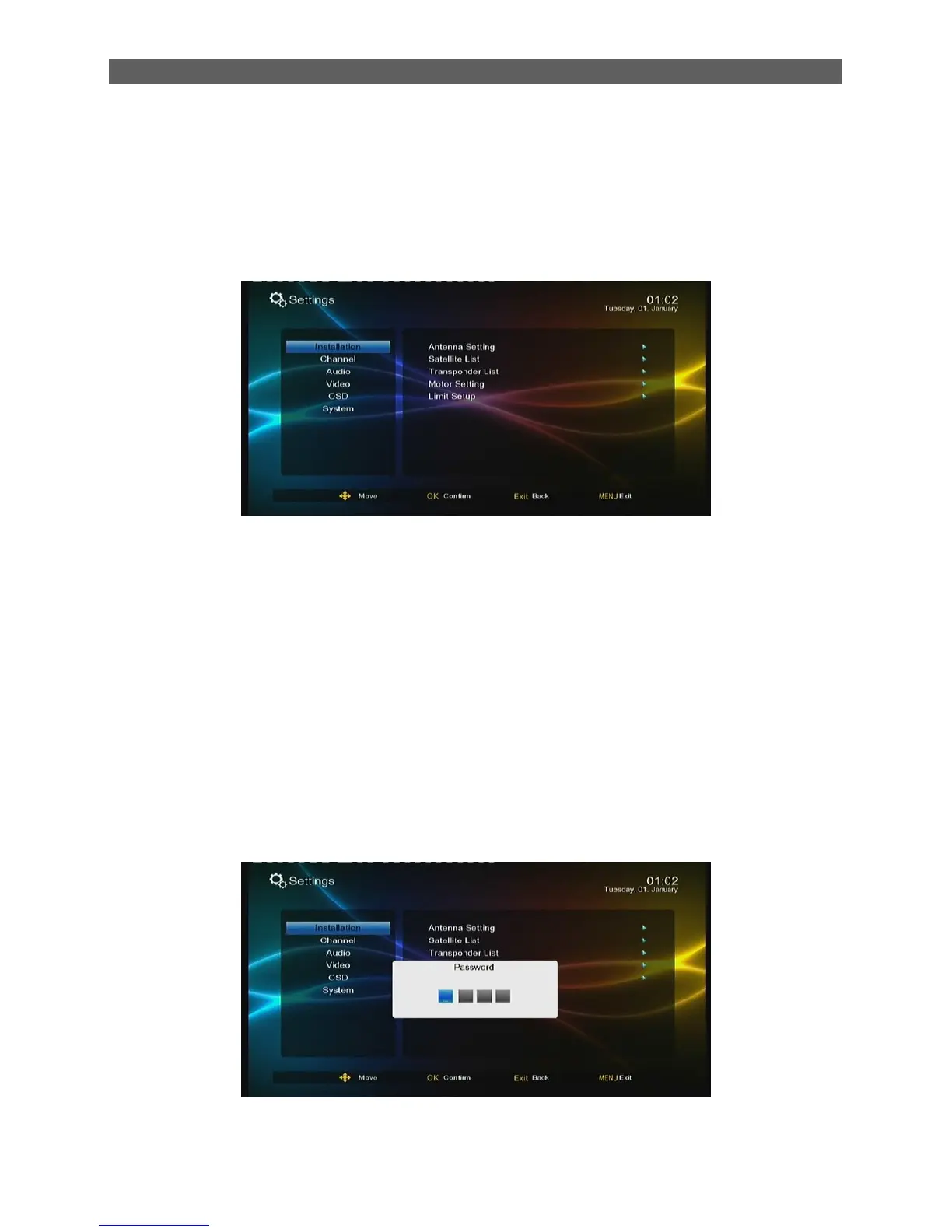 Press [▲/▼] keys in the Main Menu to highlight the Installation item and then press [OK] or [►]