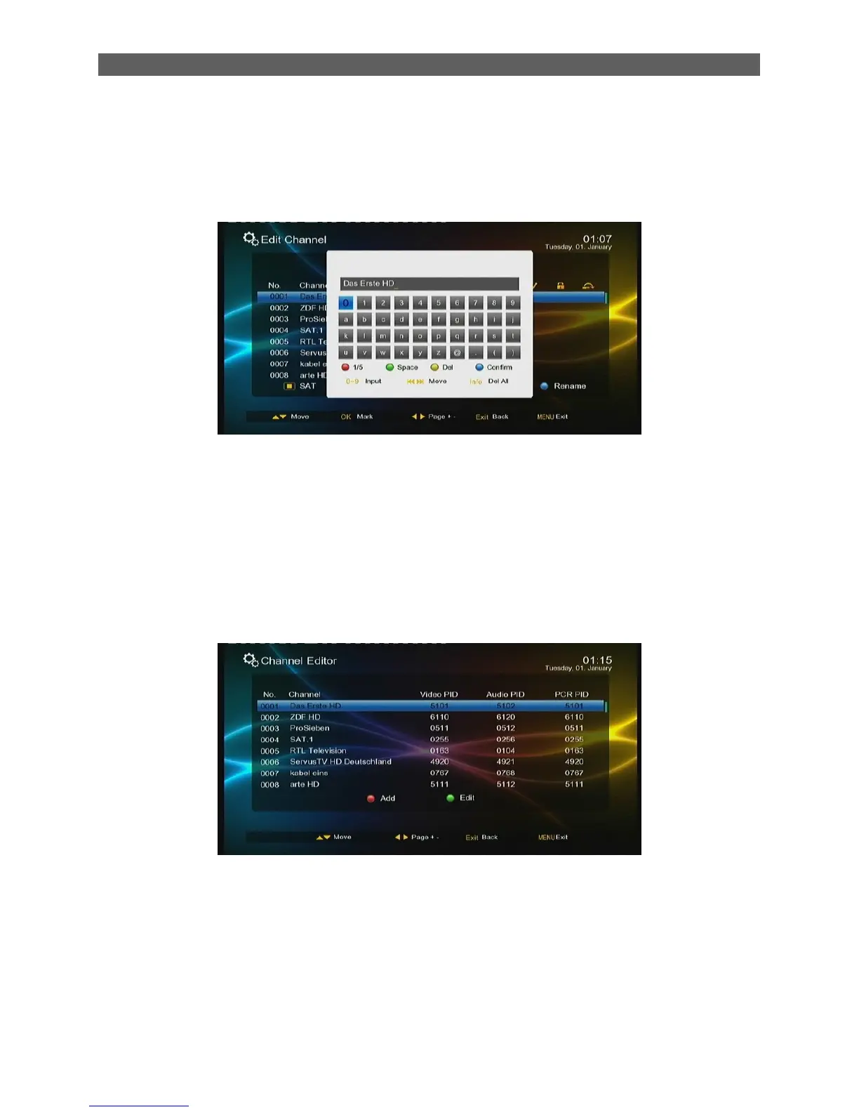 manage it: press the red function key to add a new channel; the green function key to edit the