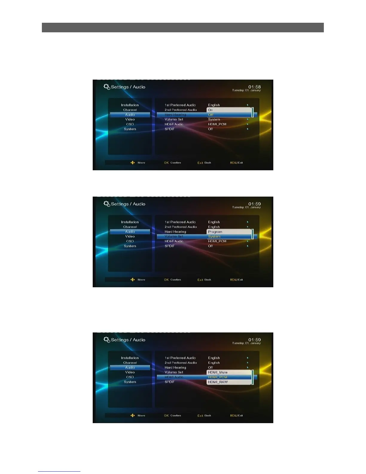 The HDMI audio item is to set the output format of audios. After highlighting this item, press [Ok]