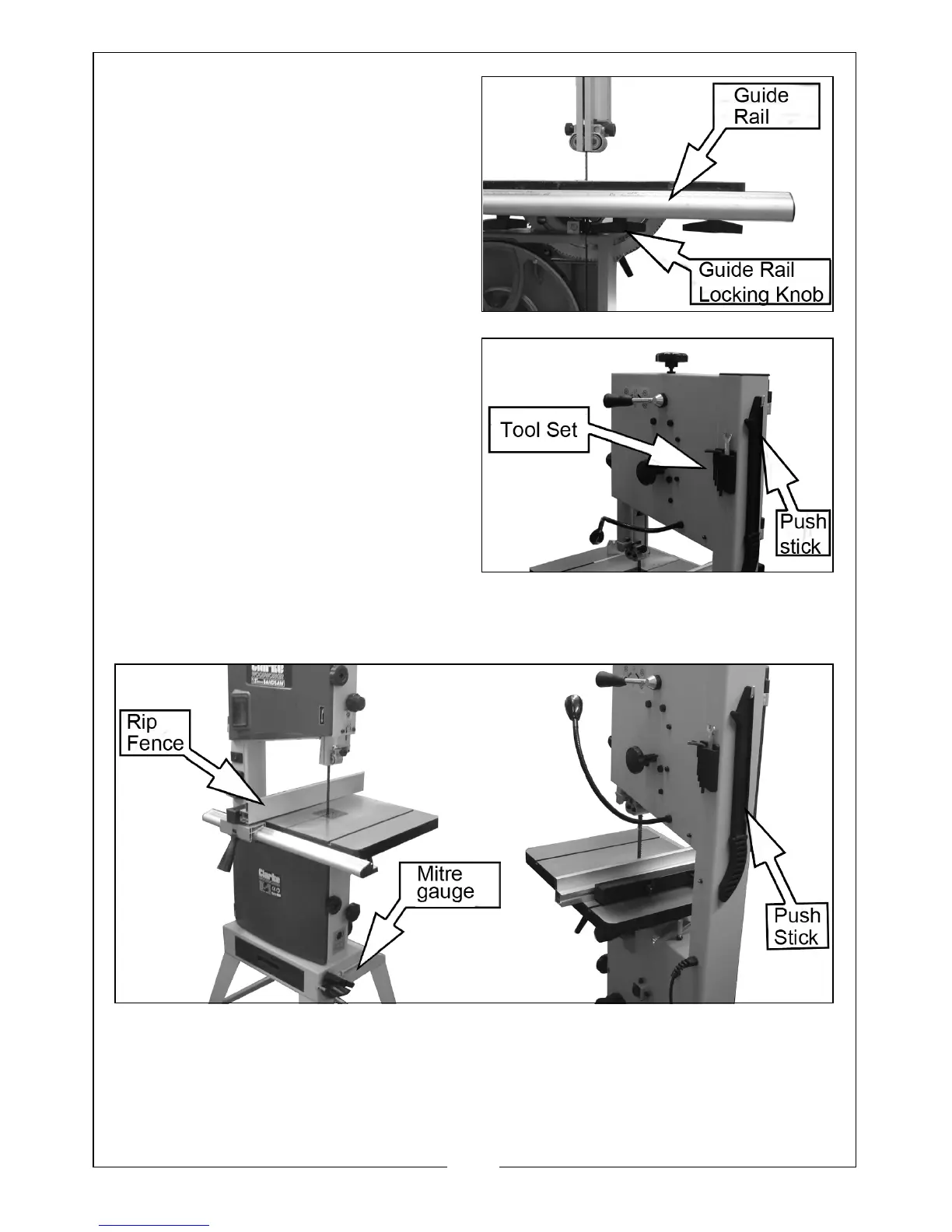 11. Store the mitre gauge in the loops provided on the lower frame base.