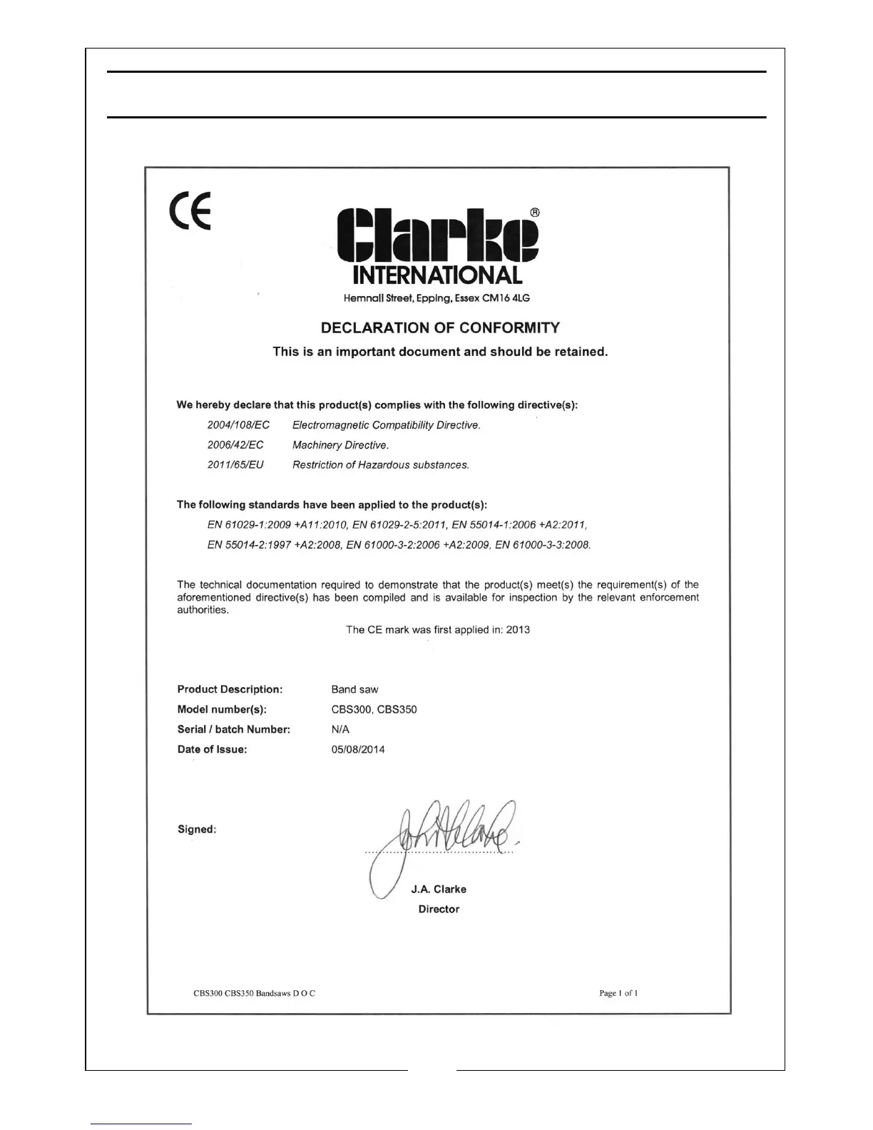 Clarke CBS300 - Declaration of Conformity