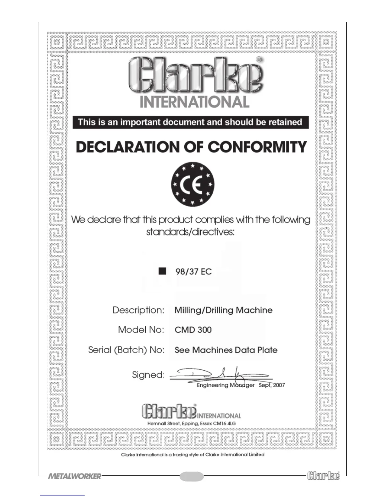 Clarke CMD300 - DECLARATION OF CONFORMITY