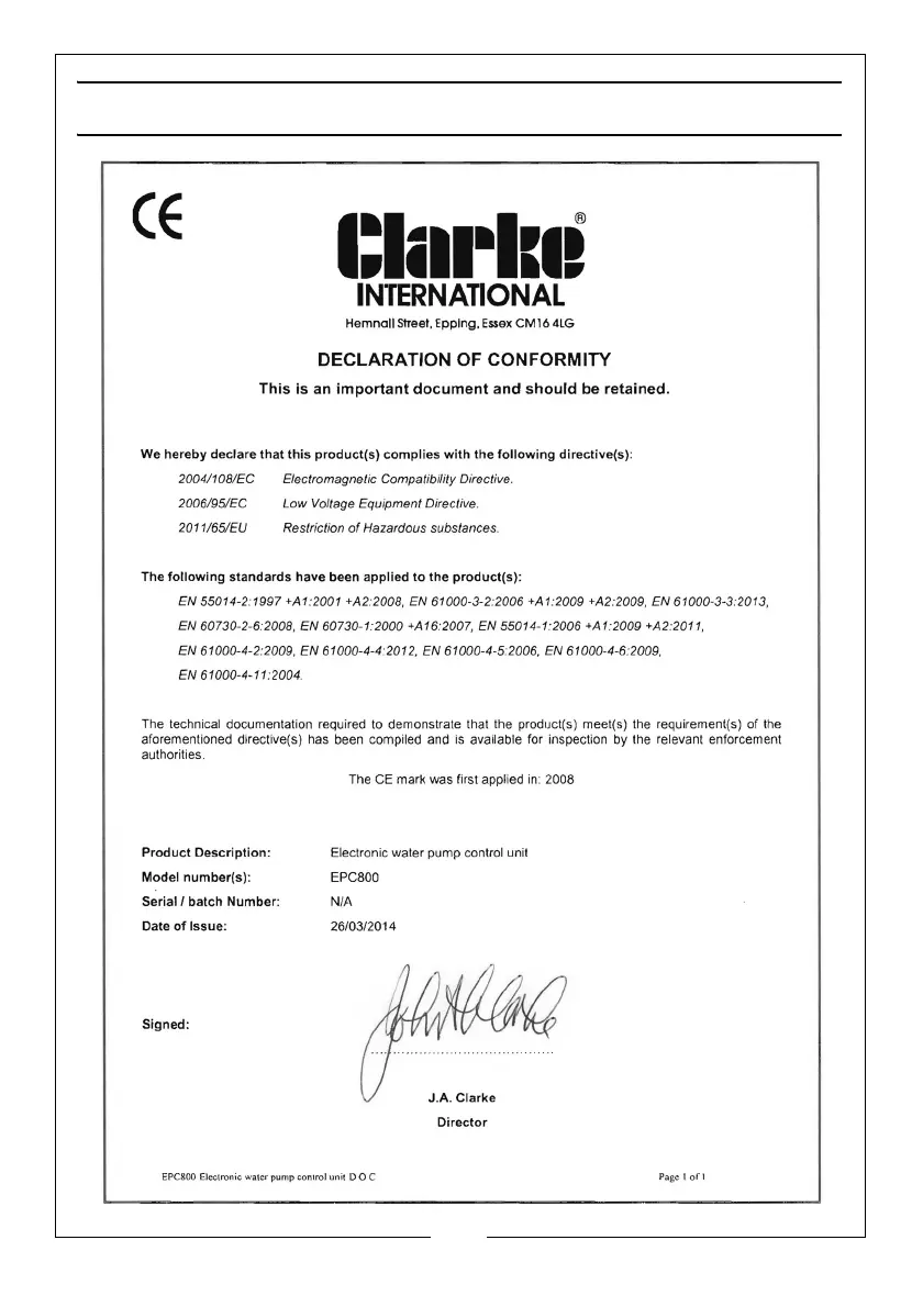 Clarke EPC800 - Declaration of Conformity; Product Compliance Directives; Product Conformity Standards; Declaration Product Details