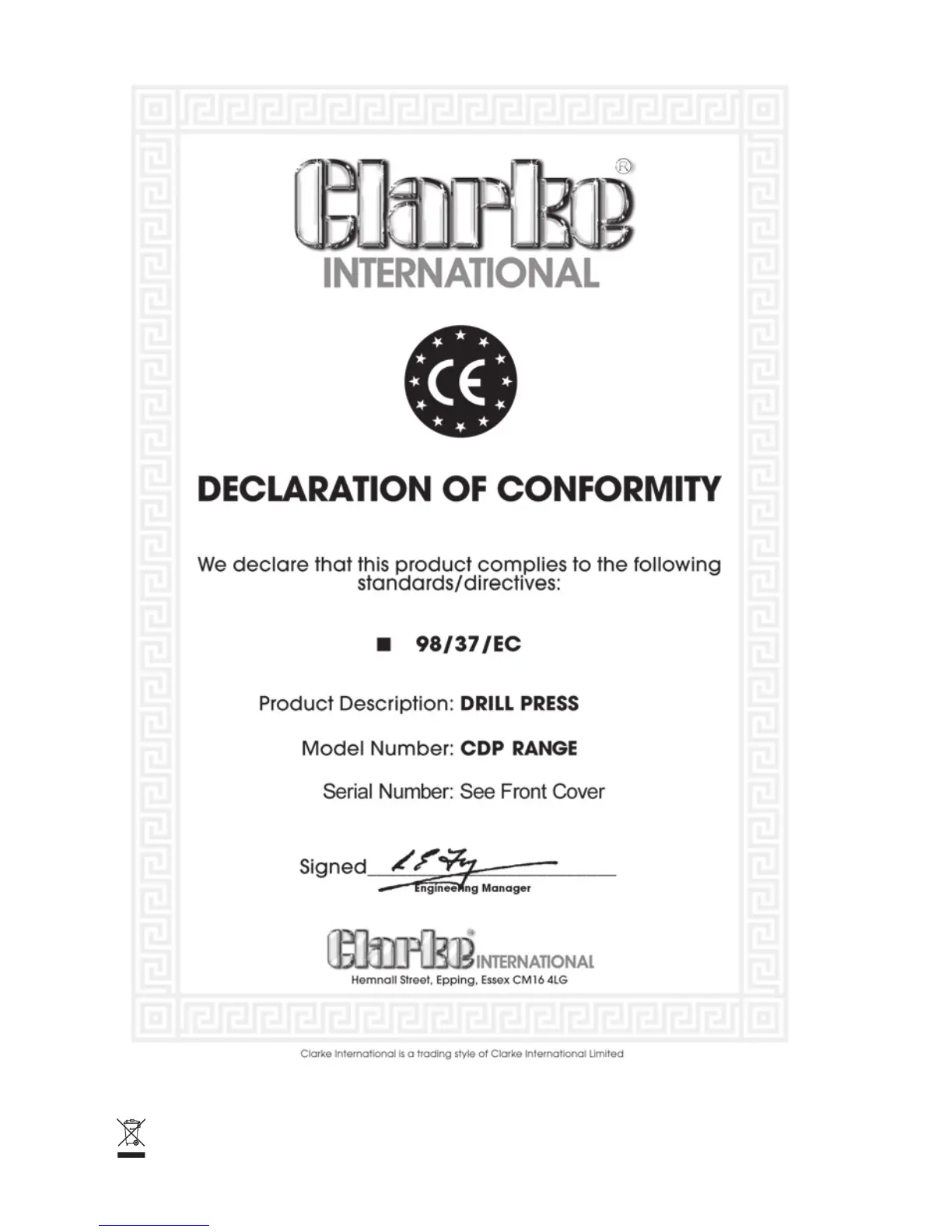 Clarke Metalworker CDP501F - Product Information; Declaration of Conformity