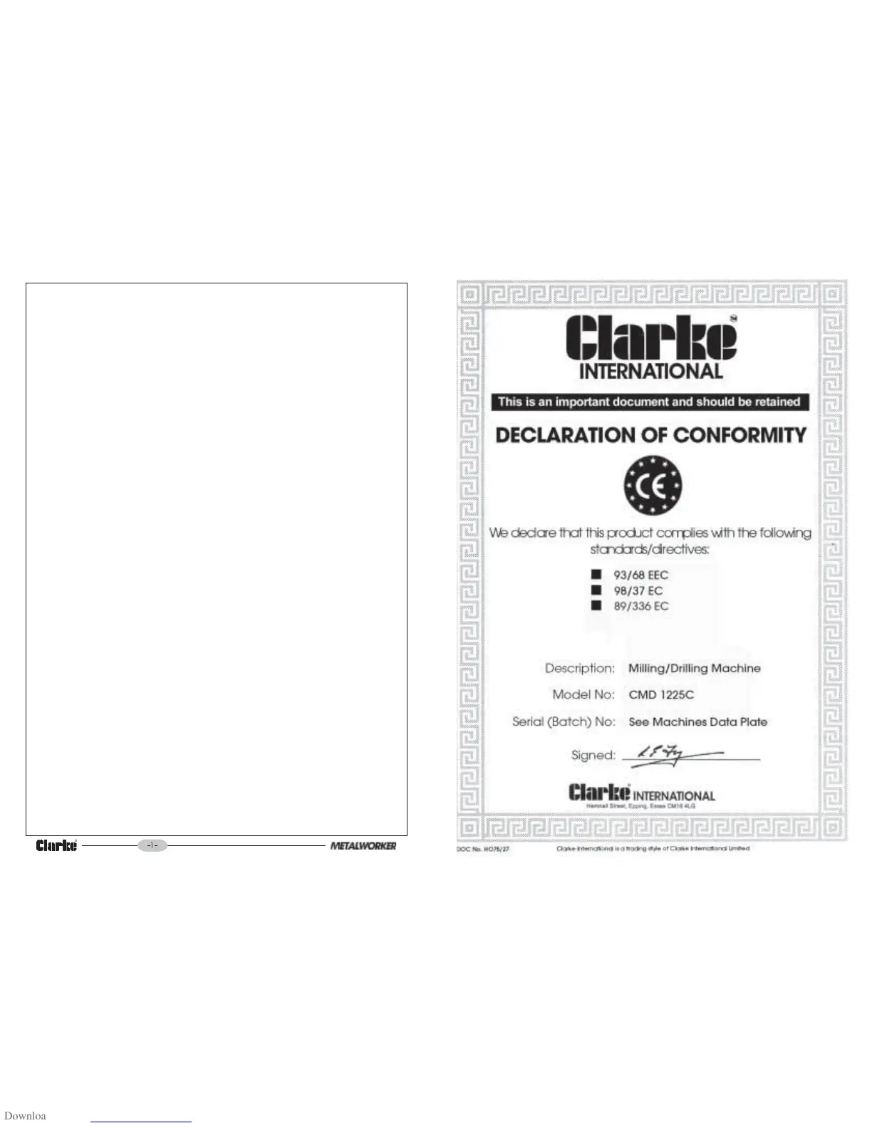 Clarke Metalworker CMD1225C - Declaration of Conformity