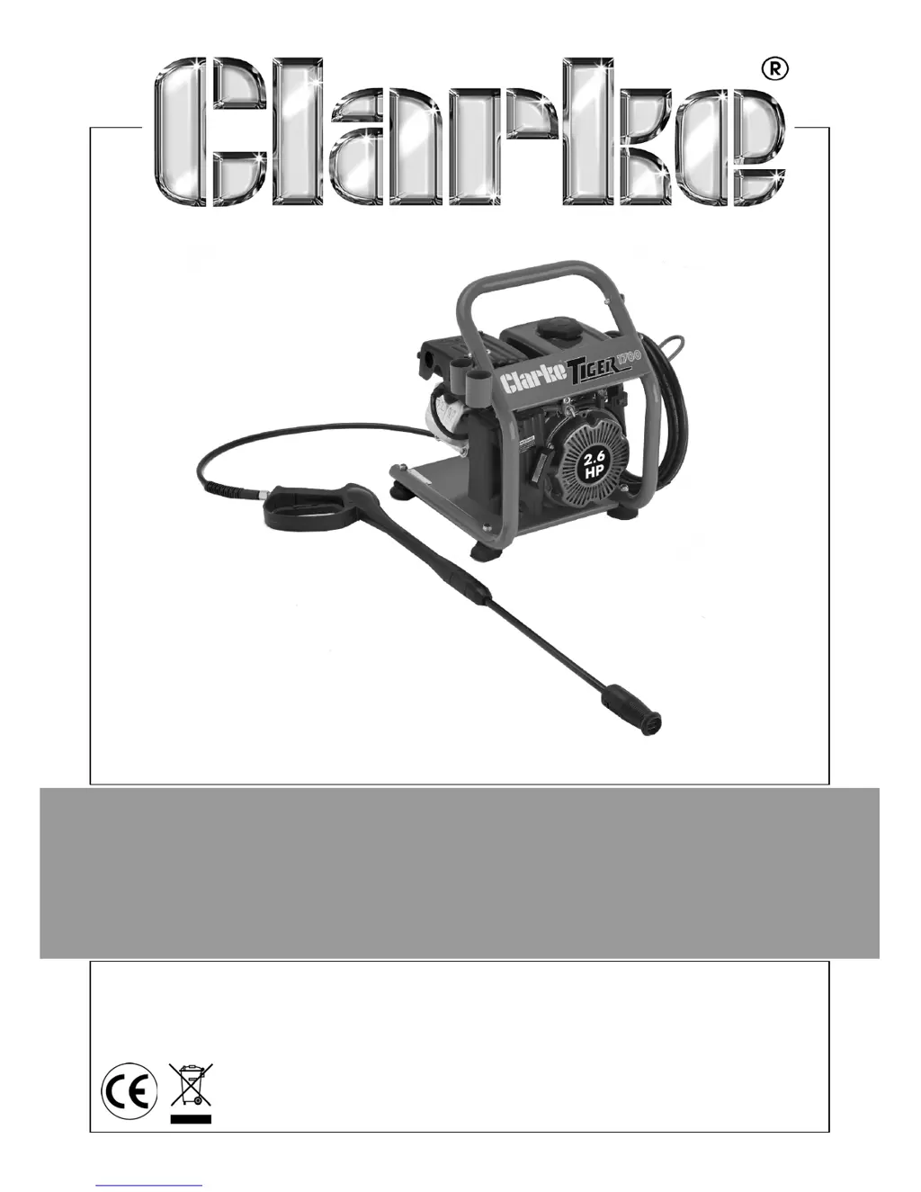 If your Clarke Pressure Washer lacks pressure upon initial use, check for a leak in the high-pressure hose fitting and tighten it, using sealant tape if needed. Clear any obstruction from the nozzle and remove and clean the water filter screen. Ensure the high pressure hose is under 100 feet. Expel air from the hose by turning off the engine and water supply, disconnecting the water source, and then turning the water on to remove air. Reconnect the hose, turn the water on, and pull the trigger to expel air from the gun/lance. Also, set the choke lever to the OFF position and ensure the throttle control lever is adequately high.