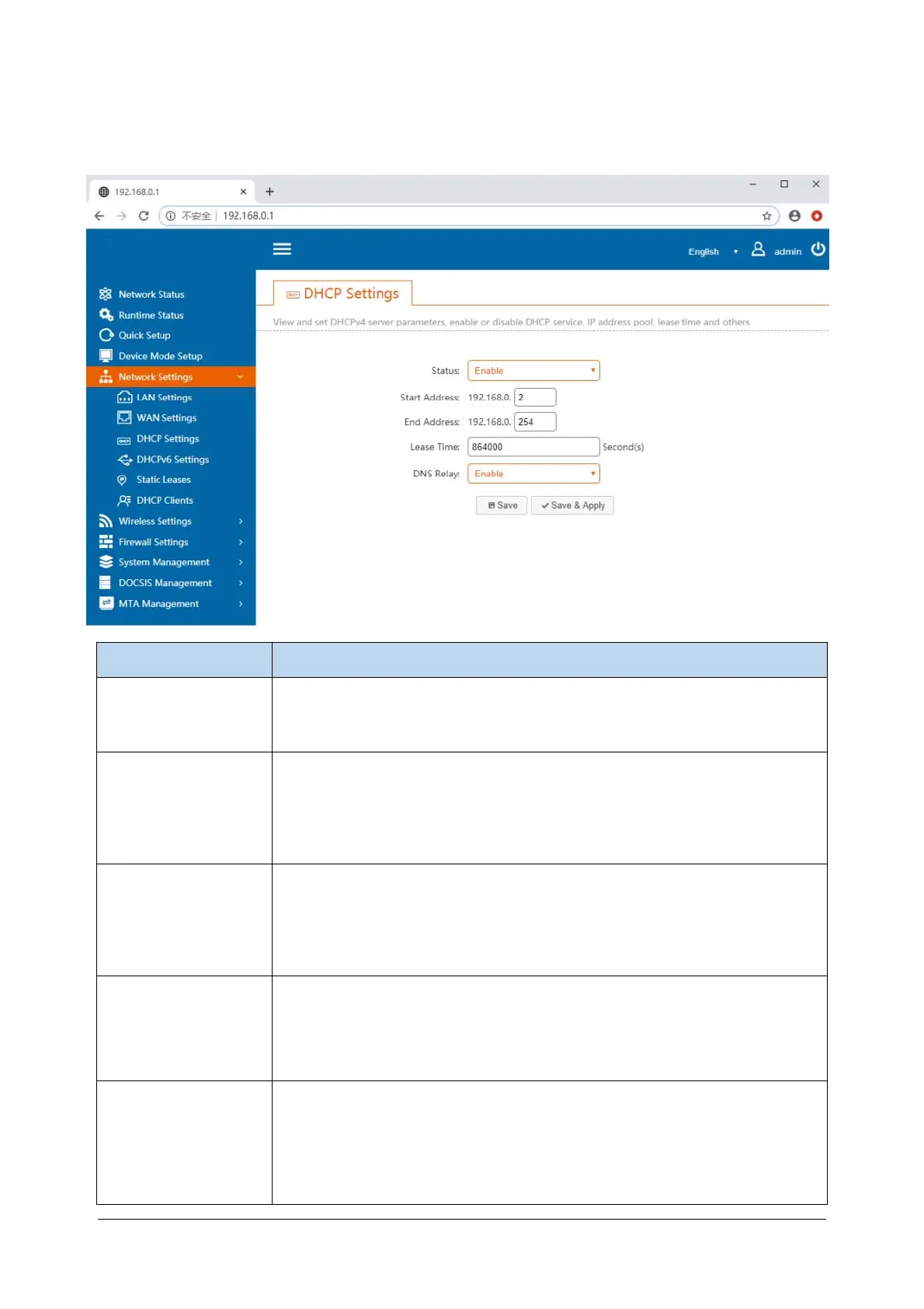 You can enable or disable the DHCP function here. The default is to enable it.
