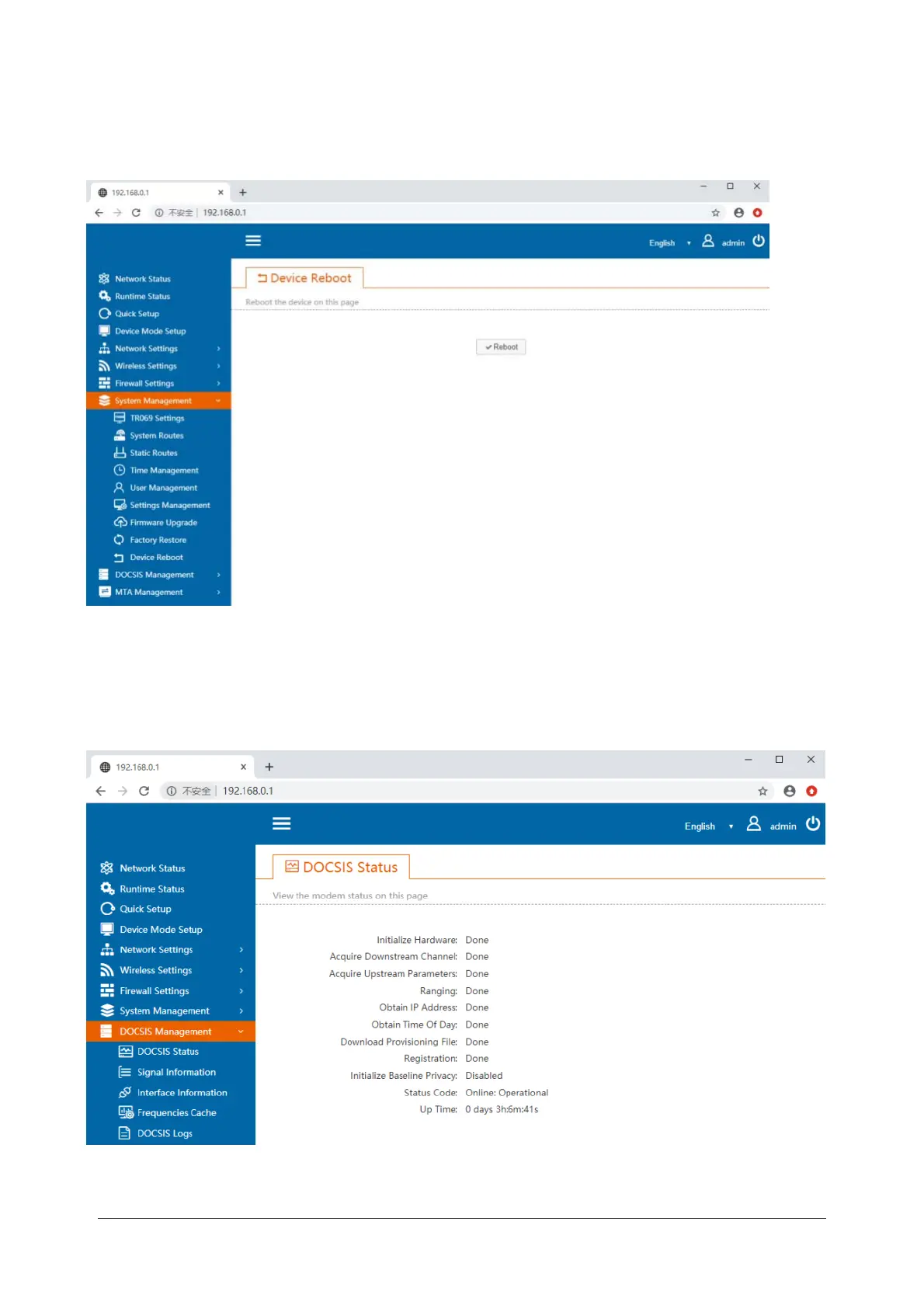 This page can view the operating information of the cable modem. Done "indicates success. If it