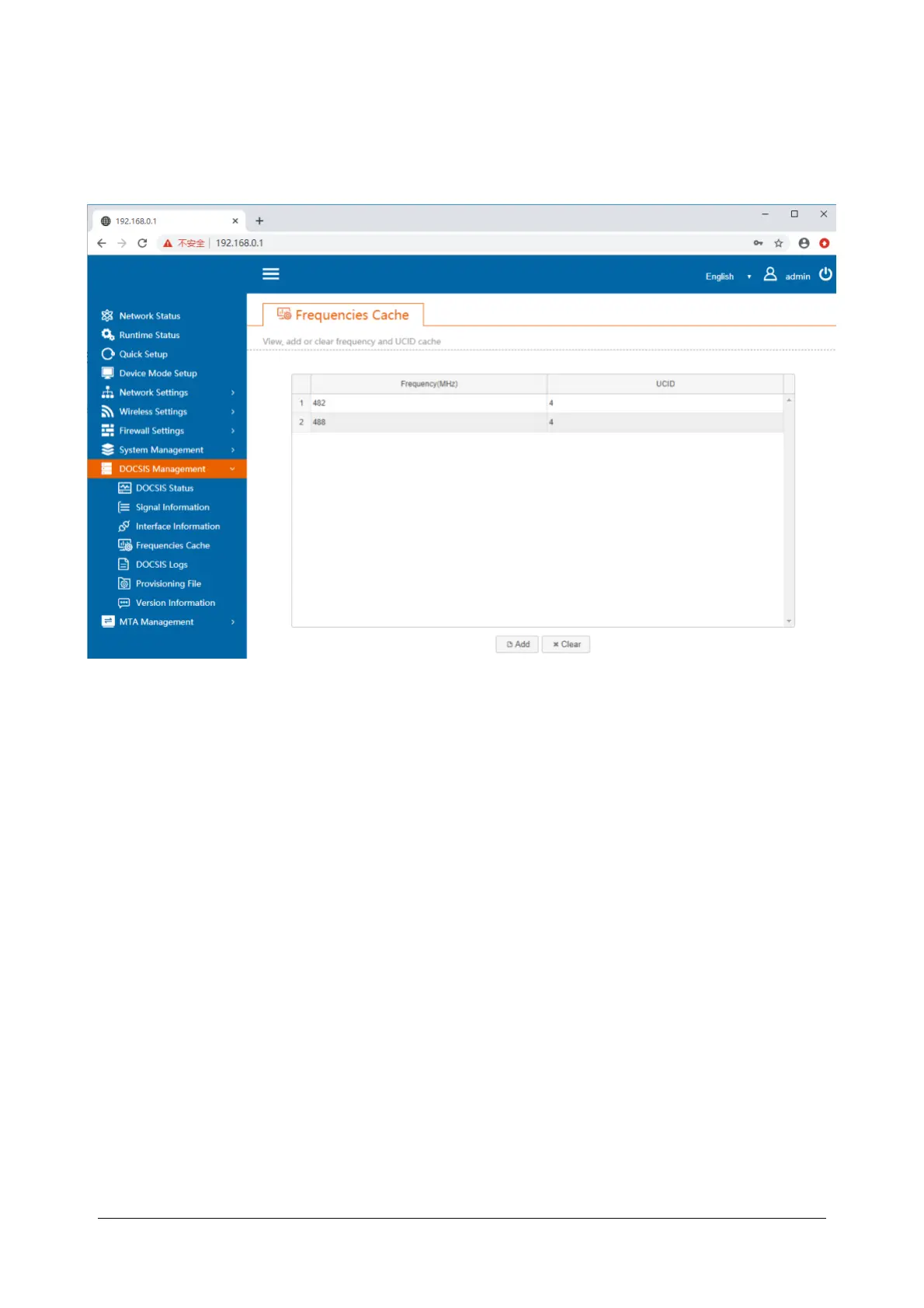 On this page, you can view the downlink frequency of the CM cache, as well as add and remove
