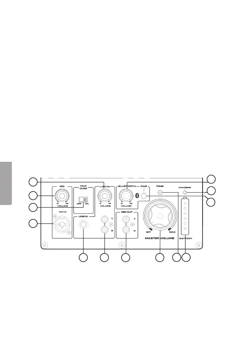 11. [ PAIR ] Liittää kaiuttimen ja toisen Bluetooth-laitteen toisiinsa. LED-valo näyttää