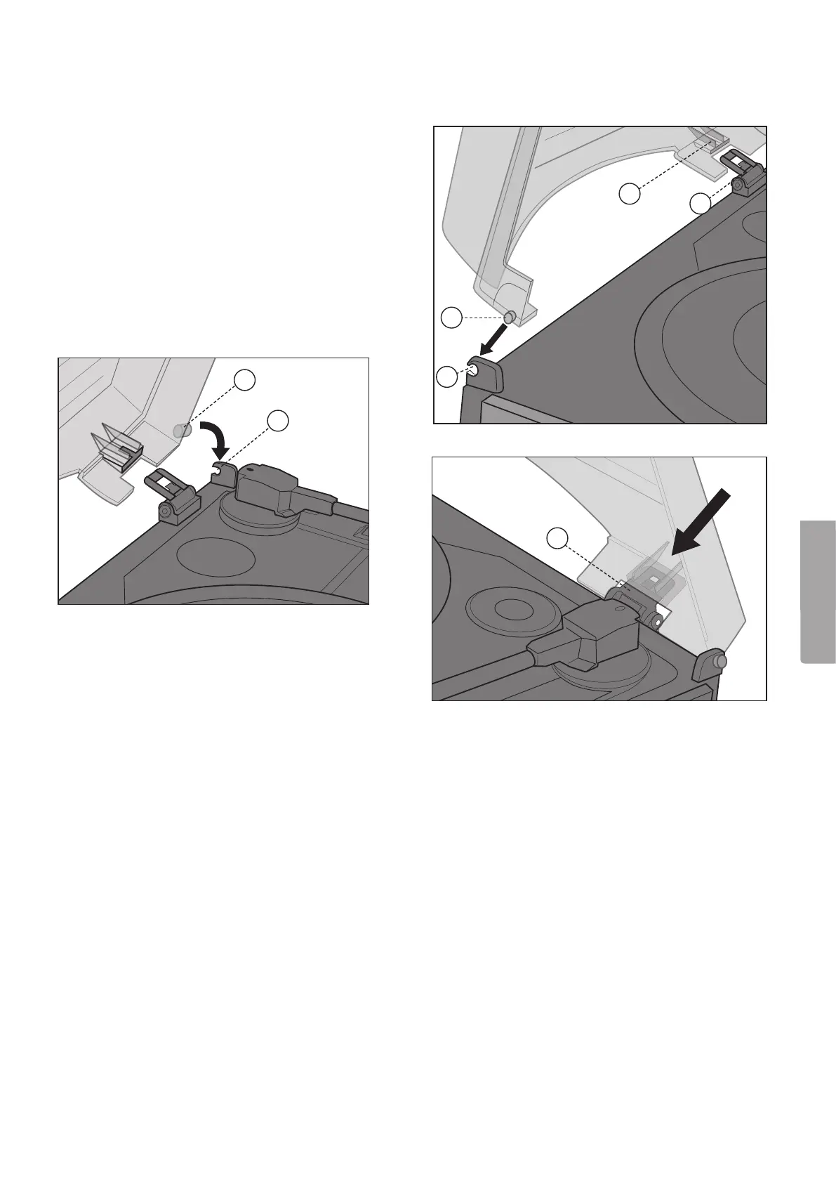 2. Työnnä kannen ura (1) saranaan (2), mutta älä työnnä
