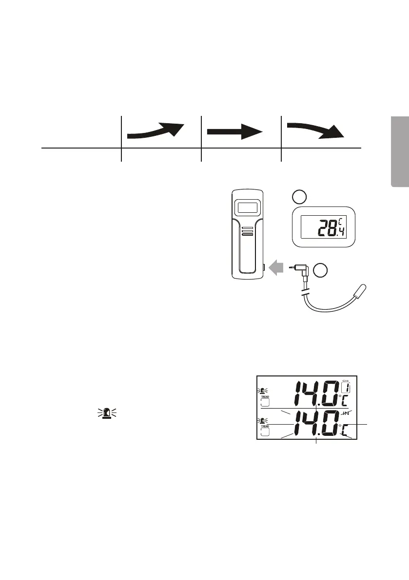 • Vid alarm för stigande temperatur visas pil uppåt irutan ”trend”.