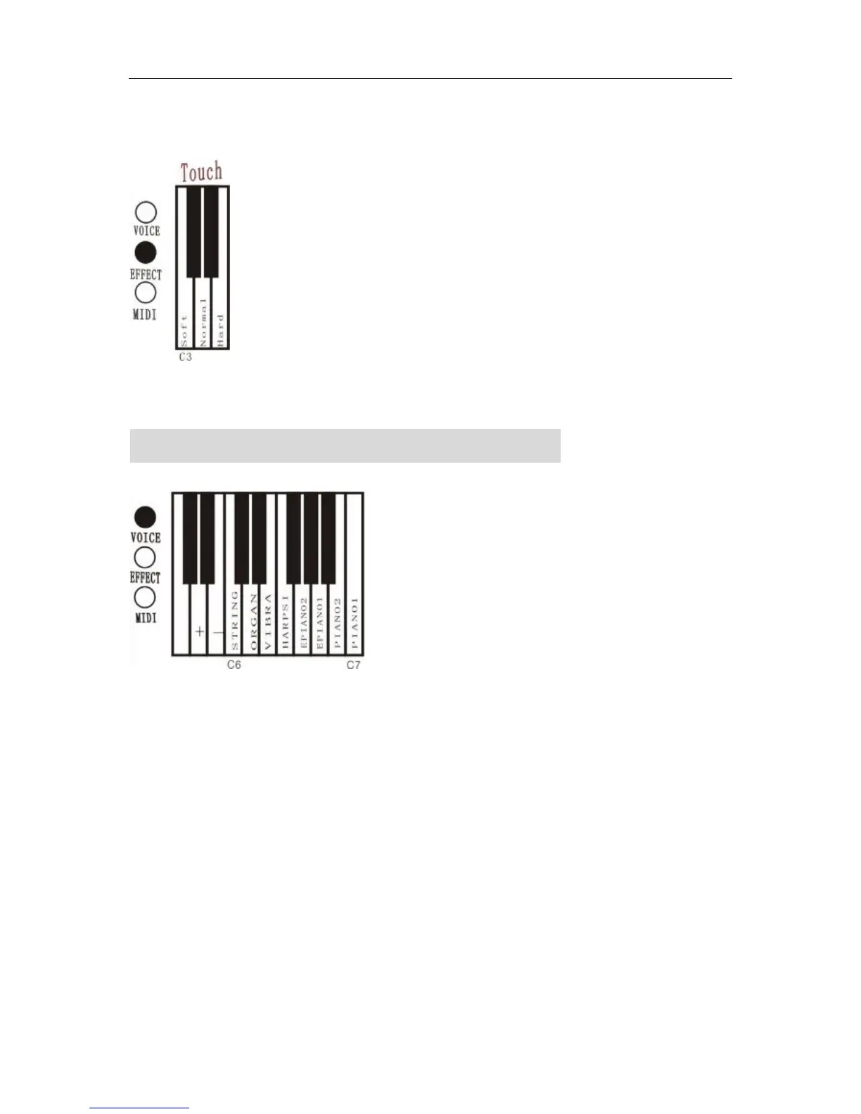 Hold down the EFFECT button and press the keyboard’s key(C3-E3), to select the touch soft, hard, and