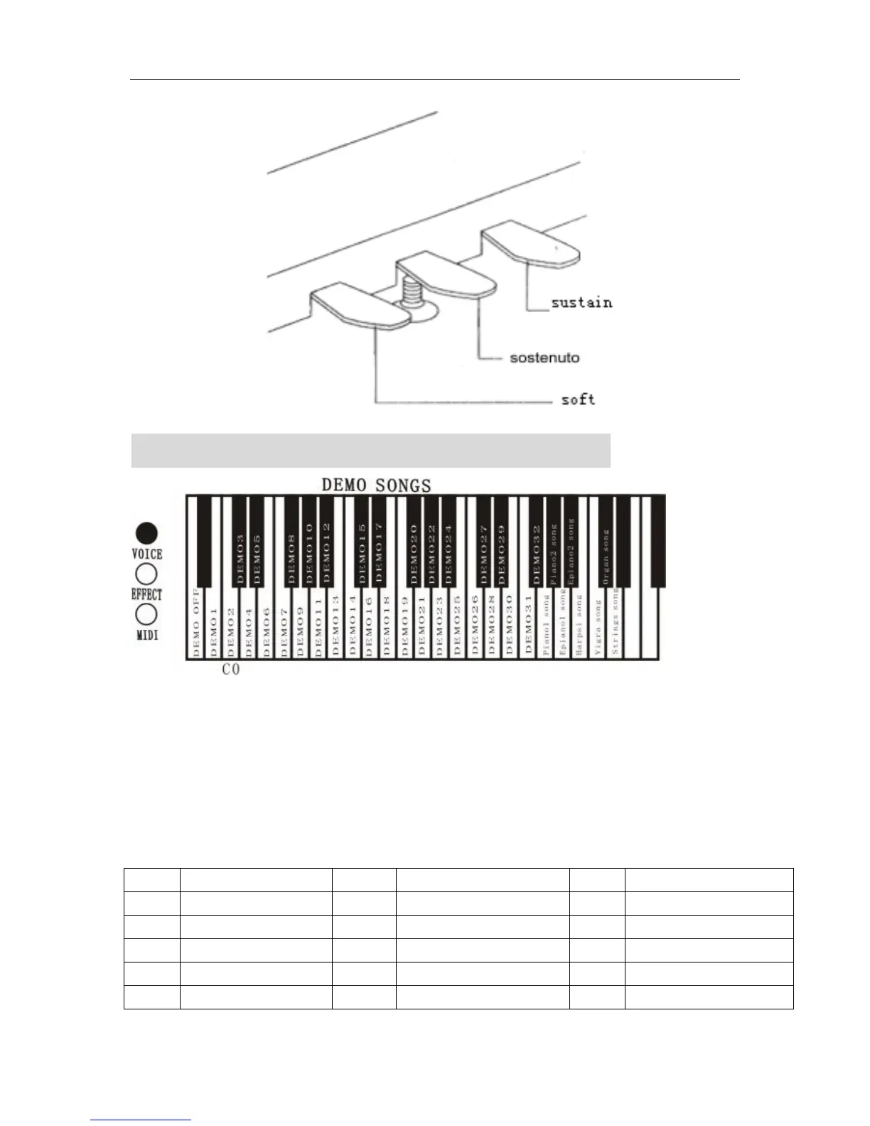 Holding press the VOICE button, and press the keyboard’s key to select demo songs..