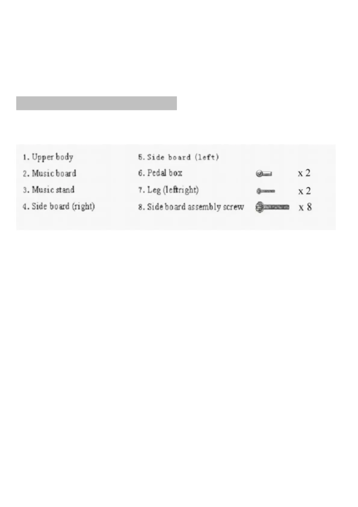 Please check you have all parts and screws before assembling your piano.