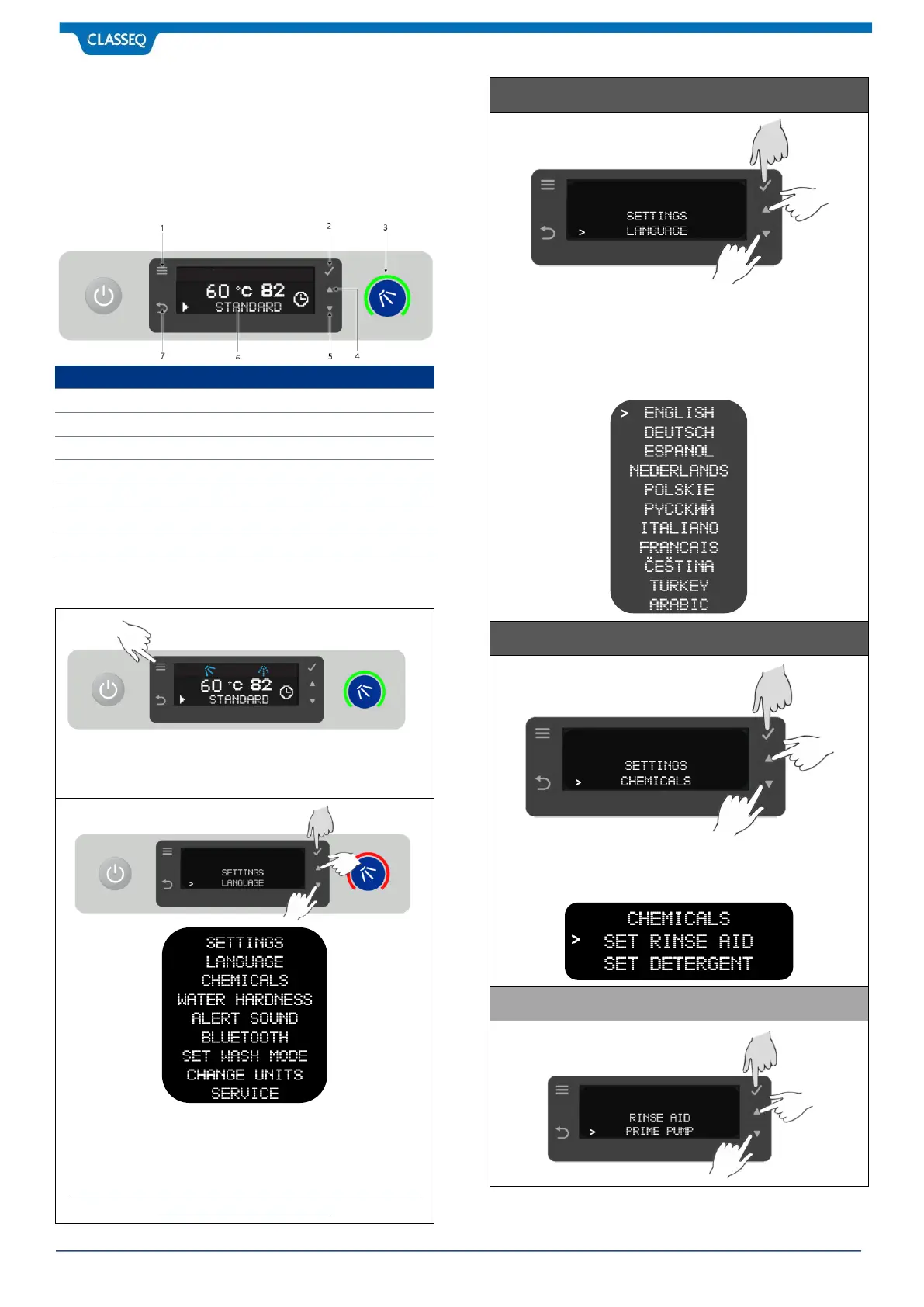 Press Menu Button (1) when warewasher is ON to enter the