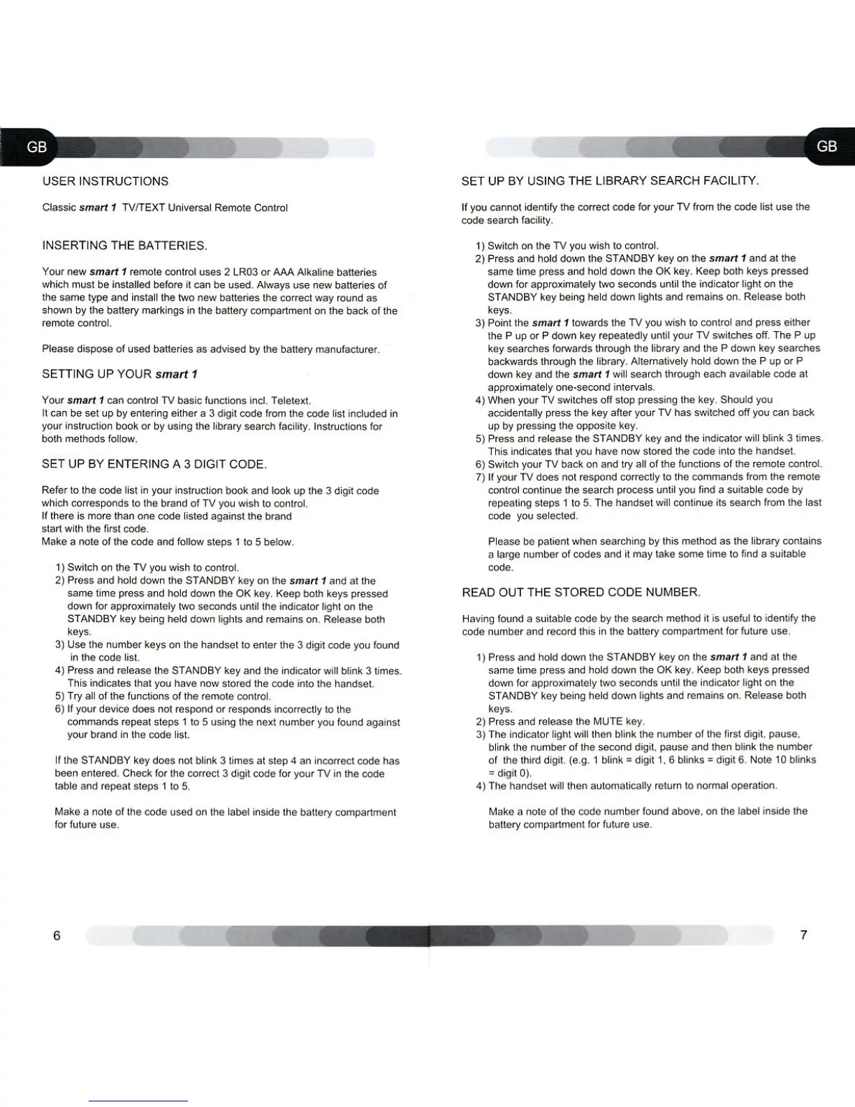 Classic Smart 1 Universal - Inserting the Batteries; Setting Up Your Remote Control; Set Up By Entering A 3 Digit Code; Set Up By Using The Library Search Facility
