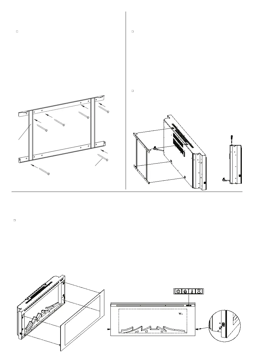 Hang the Glass Front Frame (E) on the Fireplace (C) with 2 Scews (CC) on both sides of the fireplace.