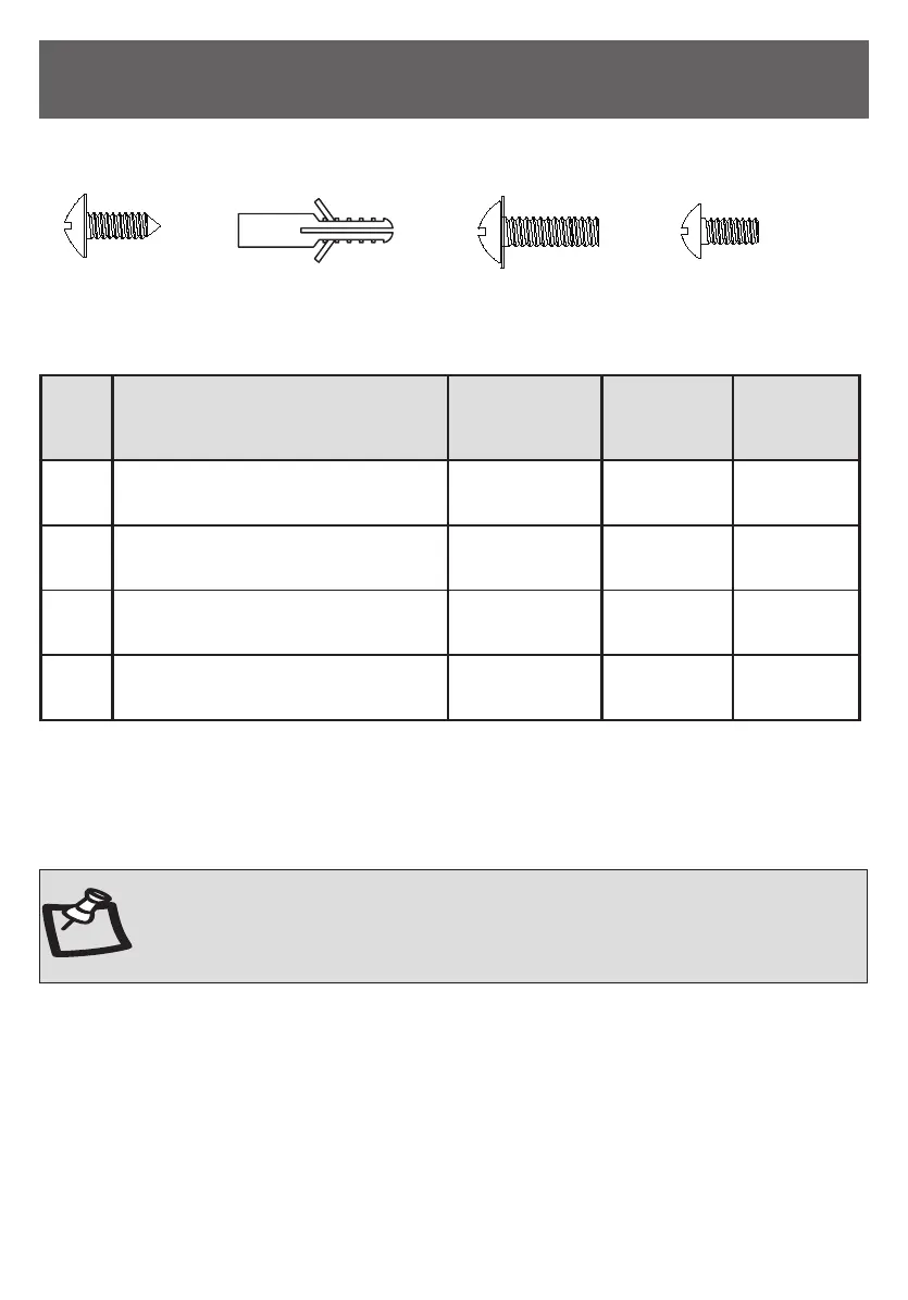 REMARQUE : La quincaillerie n’est pas illustrée dans ses dimensions réelles.